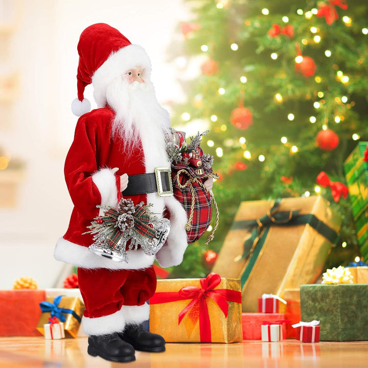- Traditionelles Weihnachtsmann-Design: Der Weihnachtsmann trägt einen langen roten Samt und einen schmalen langen Mantel. Der Weihnachtsmann trägt einen grossen Samtbeutel voller Geschenke, in der einen Hand ein Waldhorn und in der anderen eine Tüte