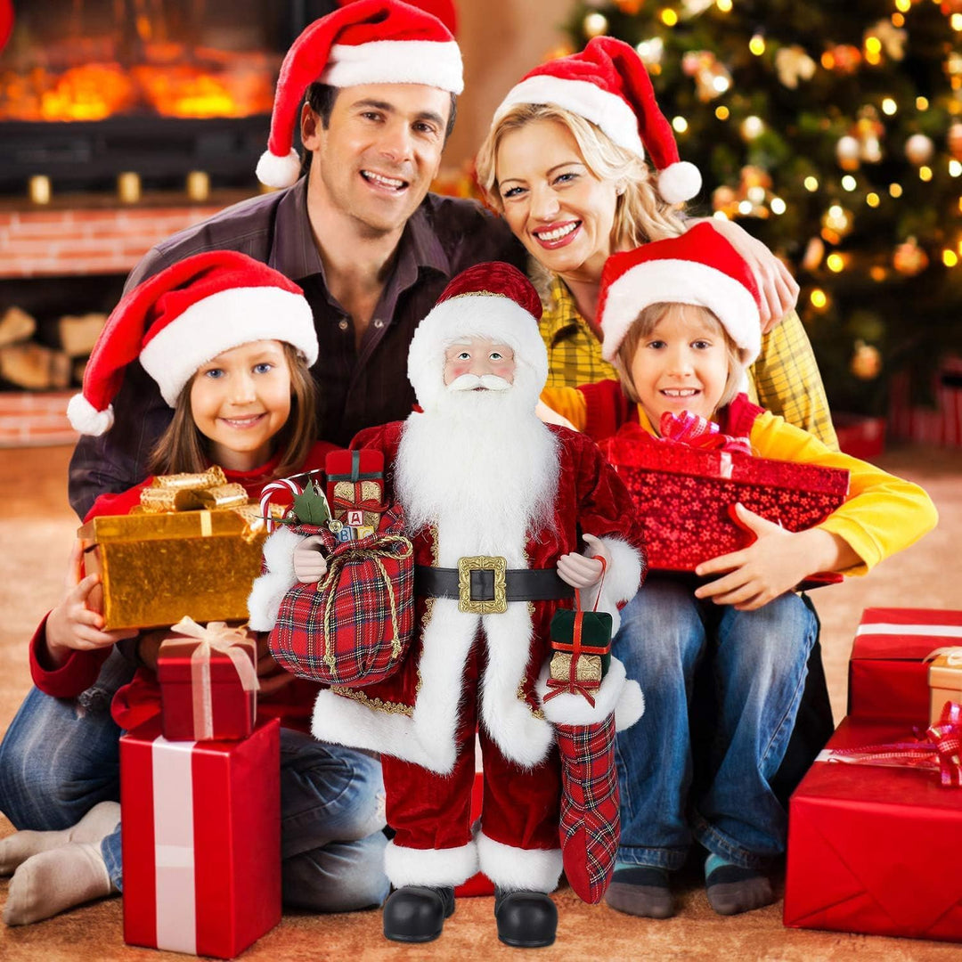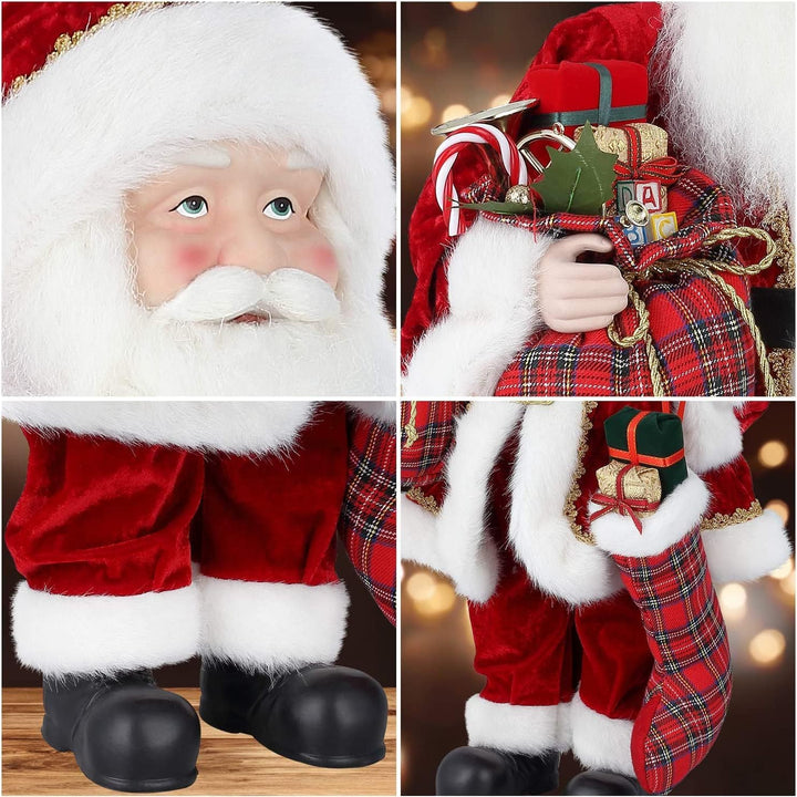 • Traditionelles Weihnachtsmann-Design: Der Weihnachtsmann trägt langen roten Samt und einen schmalen langen Mantel, trägt einen grossen Samtbeutel voller Geschenke und roter Beeren und nimmt einen niedlichen Frotteebären und die Geschenkliste mit. Zu