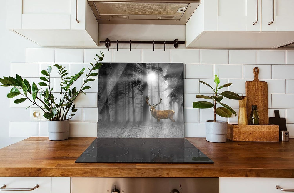 Hirsch auf Waldlichtung Sonnenstrahlen B&W Detail Herdabdeckplatte & Spritzschutz aus Echtglas | Für