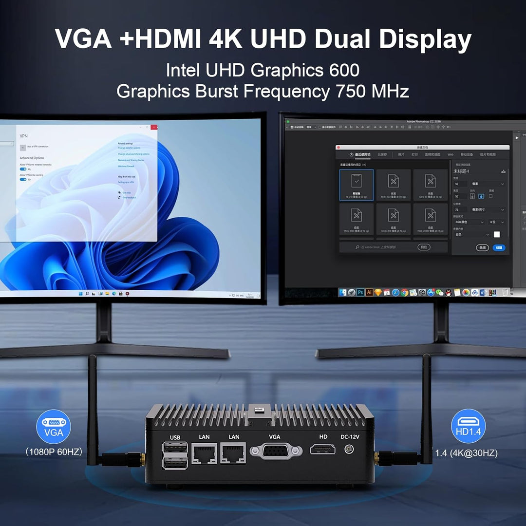 - 【Lüfterloses Kühldesign】 Das Mini-PC-Gehäuse besteht aus gebürsteter Vollaluminiumlegierung. Es ist ein perfekt leiser Computer mit lüfterlosem Design, da sich kein Lüfter im Inneren befindet, läuft der PC den ganzen Tag völlig geräuschlos,