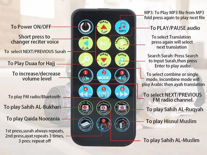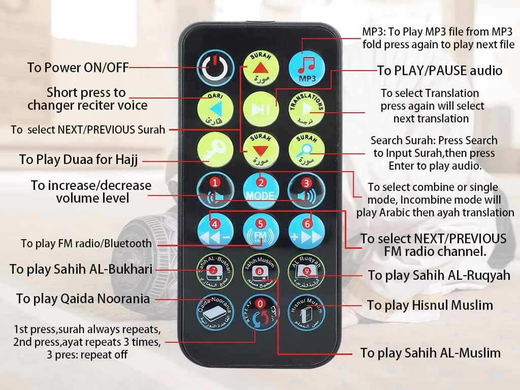 - ★Mit Fernbedienung: Verwenden Sie die Fernbedienung, um den Koran-Lautsprecher zu steuern und geniessen Sie den Spass, den gesamten Koran zu rezitieren.