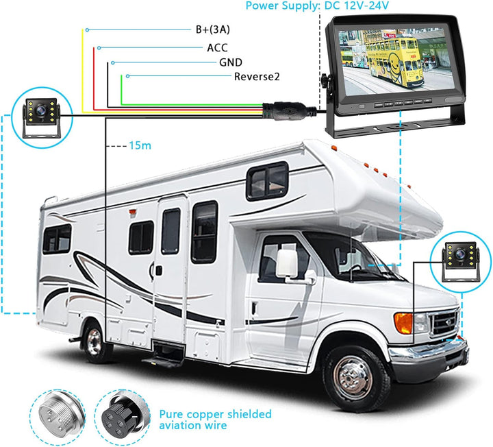 - ✔Flexible Fahrzeugkompatibilität: Spannungsbereich von 12 V bis 24 V Gleichstrom für eine Vielzahl von Fahrzeugen wie Anhänger, Lastwagen, Autos, Wohnmobile, Vans, Busse. Das kabelgebundene Rückfahrkamerasystem ist auch einfach zu installieren,
