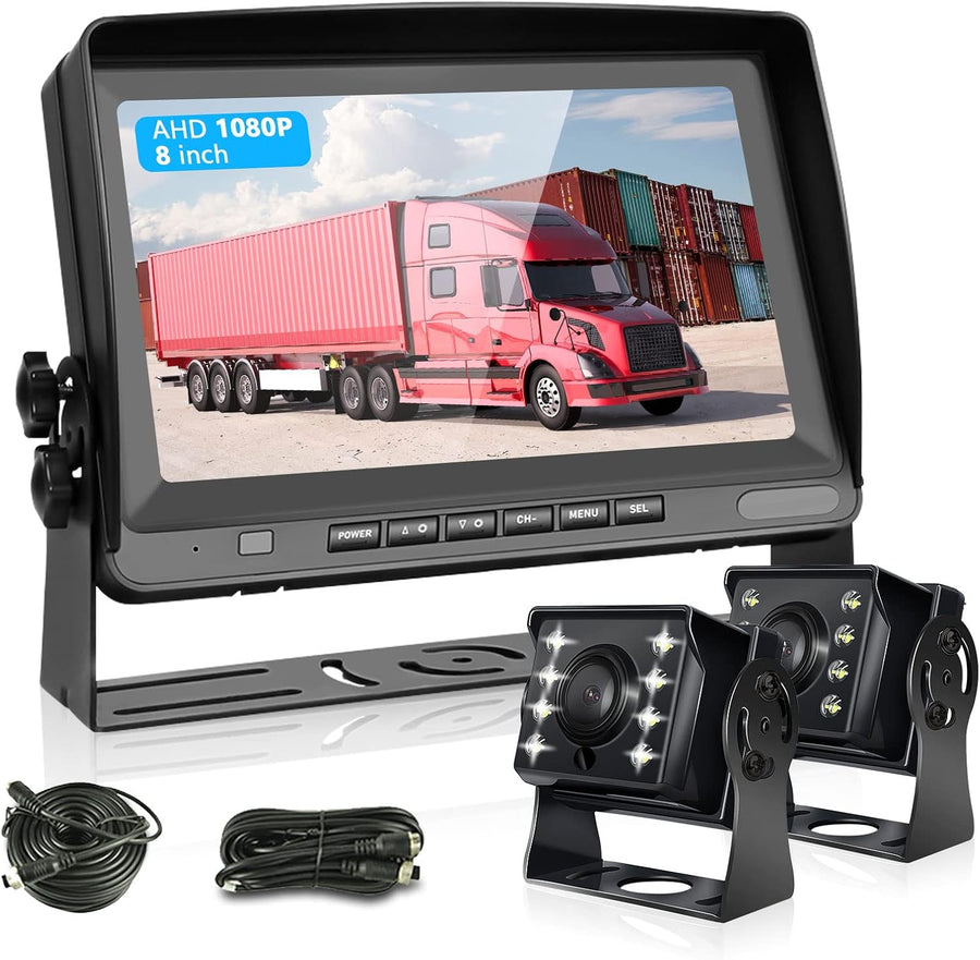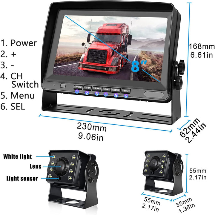 - ✔ Packungsinhalt: 1 x 8" Automonitor, 2 x Rückfahrkamera, 1 x 5 m (16.4 ft) Videokabel, 1 x 15 m (49,2 ft) Videokabel, 1 x Fernbedienung, 1 x Halterung, 1 x Sonnenschutz; Wenn Sie feststellen, dass das Produkt fehlerhaft ist oder ein Kabel anderer