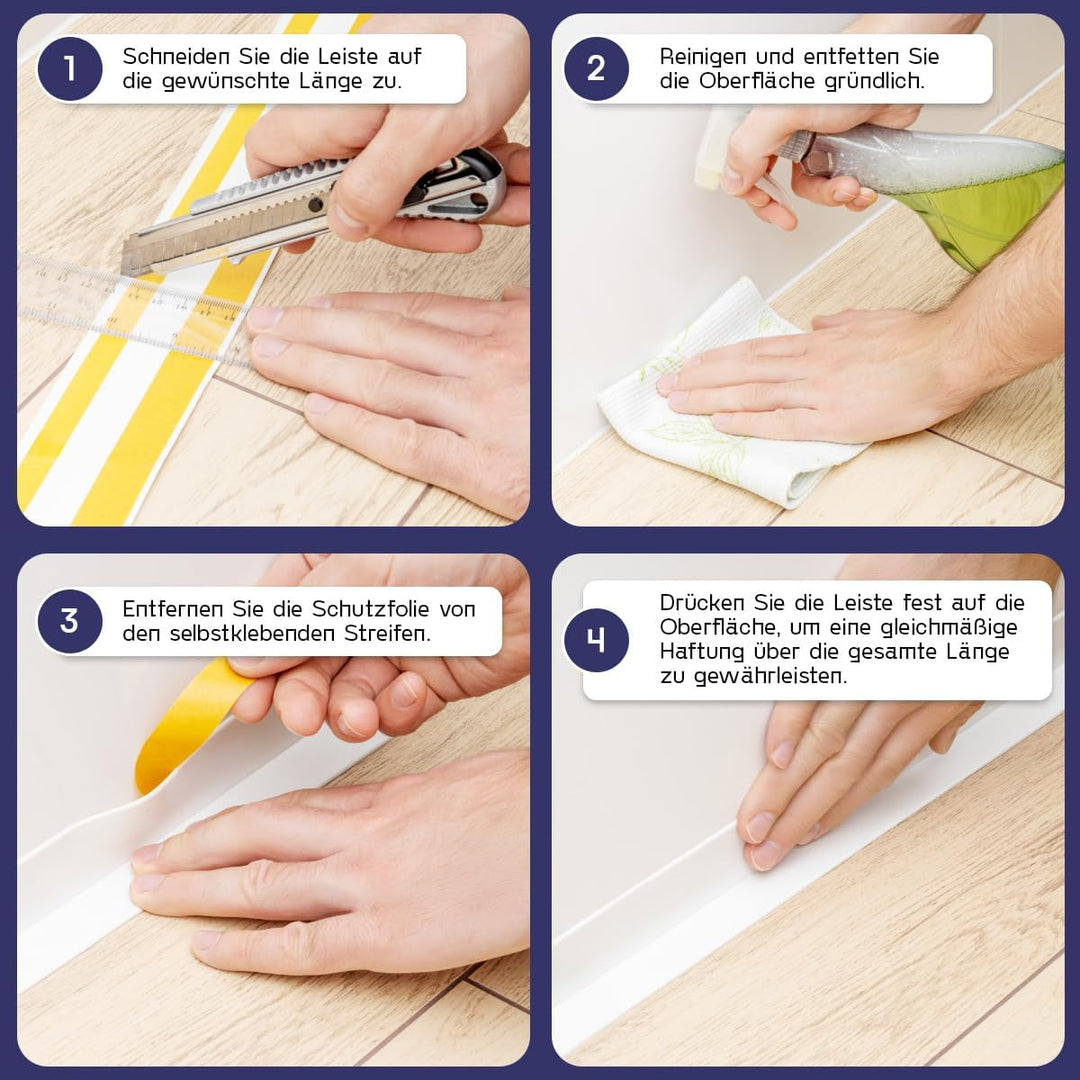 - Wichtig: Für die bestmögliche Haftung des Klebstoffes sollten Sie die Oberfläche vor der Montage der Weichsockelleiste gründlich reinigen und entfetten. Je nach der Art der Oberfläche könnten Sie z. B. Leichtbenzin verwenden. Wir empfehlen eine