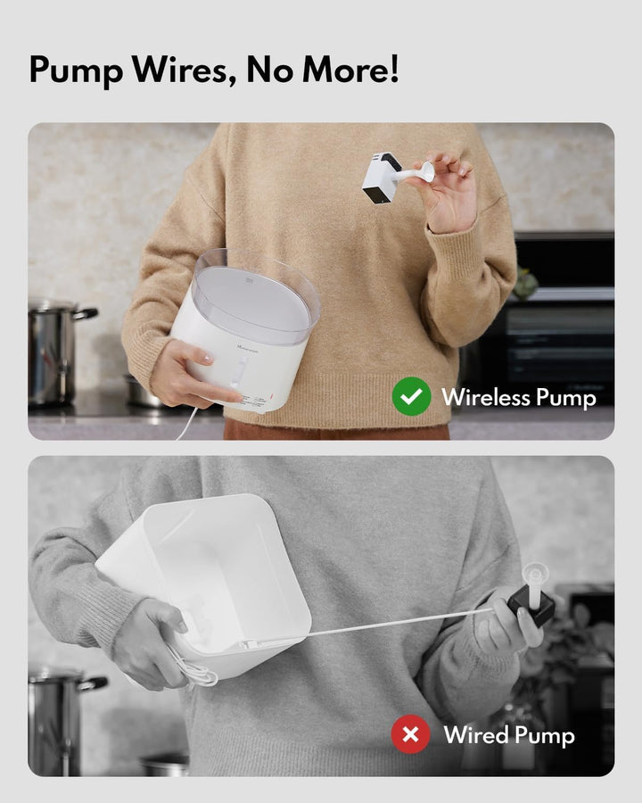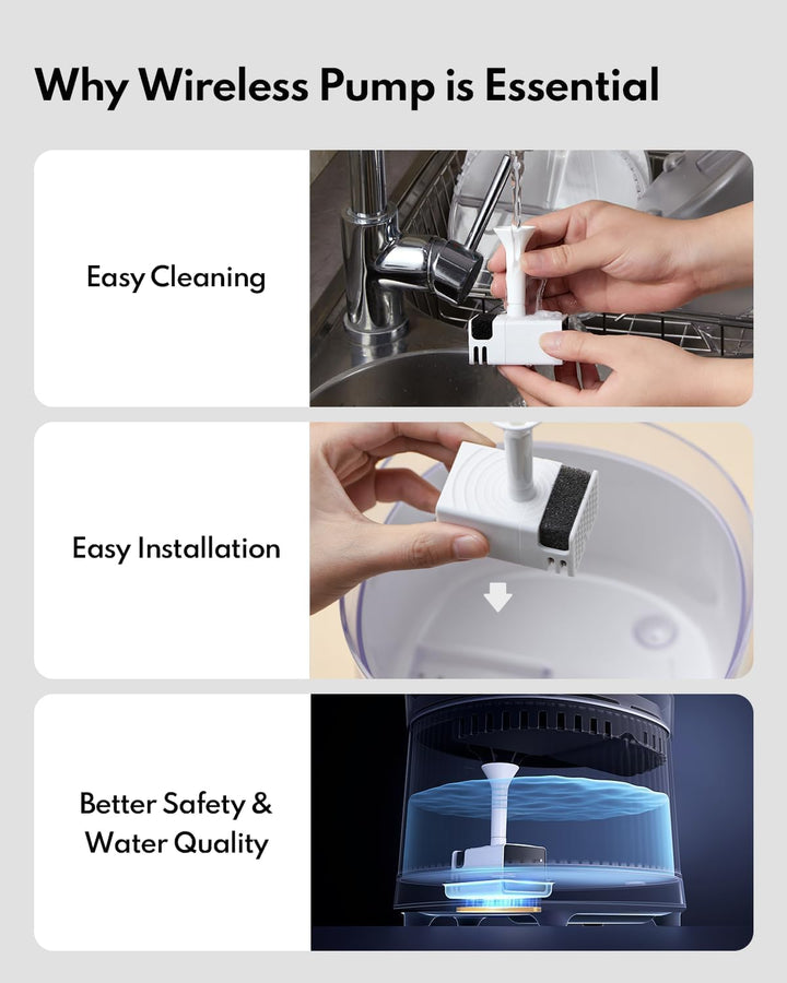 - 【Abschied vom Pumpenkabel】Sorgen Sie sich um einen Stromschlag, wenn Ihr Haustier aus dem Trinkbrunnen trinkt, oder stören Sie sich an den Kabeln beim Reinigen? Homerunpet Katzenbrunnen mit kabelloser Pumpe bietet die Lösung. Da das Kabel nicht im