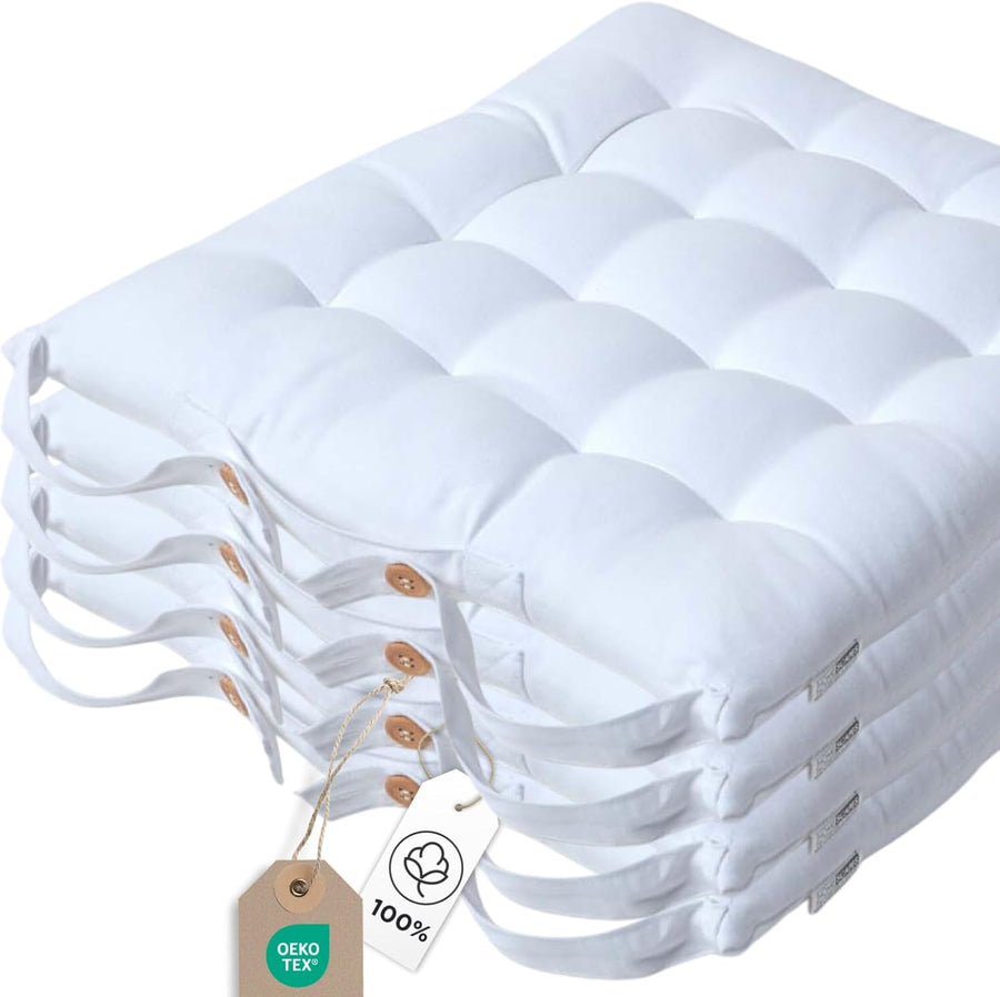 - Set aus 4 Sitzkissen mit Bändern und praktischem Knopfverschluss. Grösse je Stuhlpolster: ca. 40 x 40 x 5 cm. Farbe: weiss.