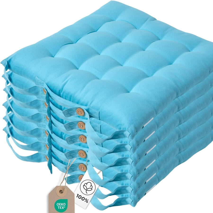 - Set aus 6 Sitzkissen mit Bändern und praktischem Knopfverschluss. Grösse je Stuhlpolster: ca. 40 x 40 x 5 cm. Farbe: hellblau.