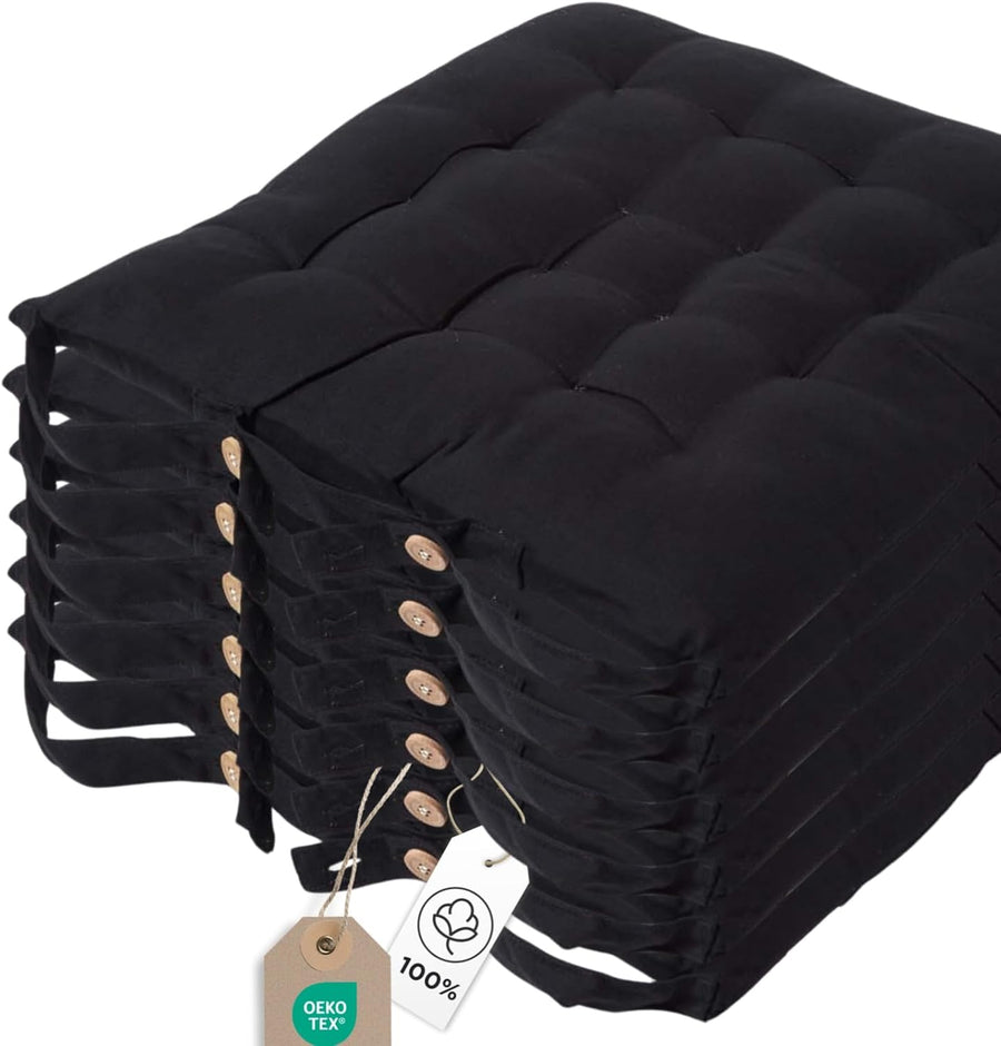Homescapes 6er Set Stuhlkissen 40 x 40 cm, schwarz, Sitzkissen mit Bändern und Knopfverschluss, einf