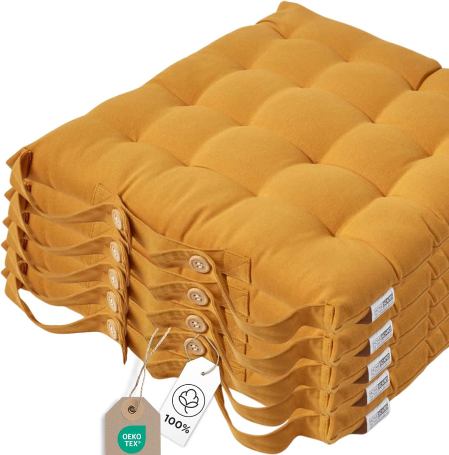 - Set aus 6 Sitzkissen mit Bändern und praktischem Knopfverschluss. Grösse je Stuhlpolster: ca. 40 x 40 x 5 cm. Farbe: senfgelb.