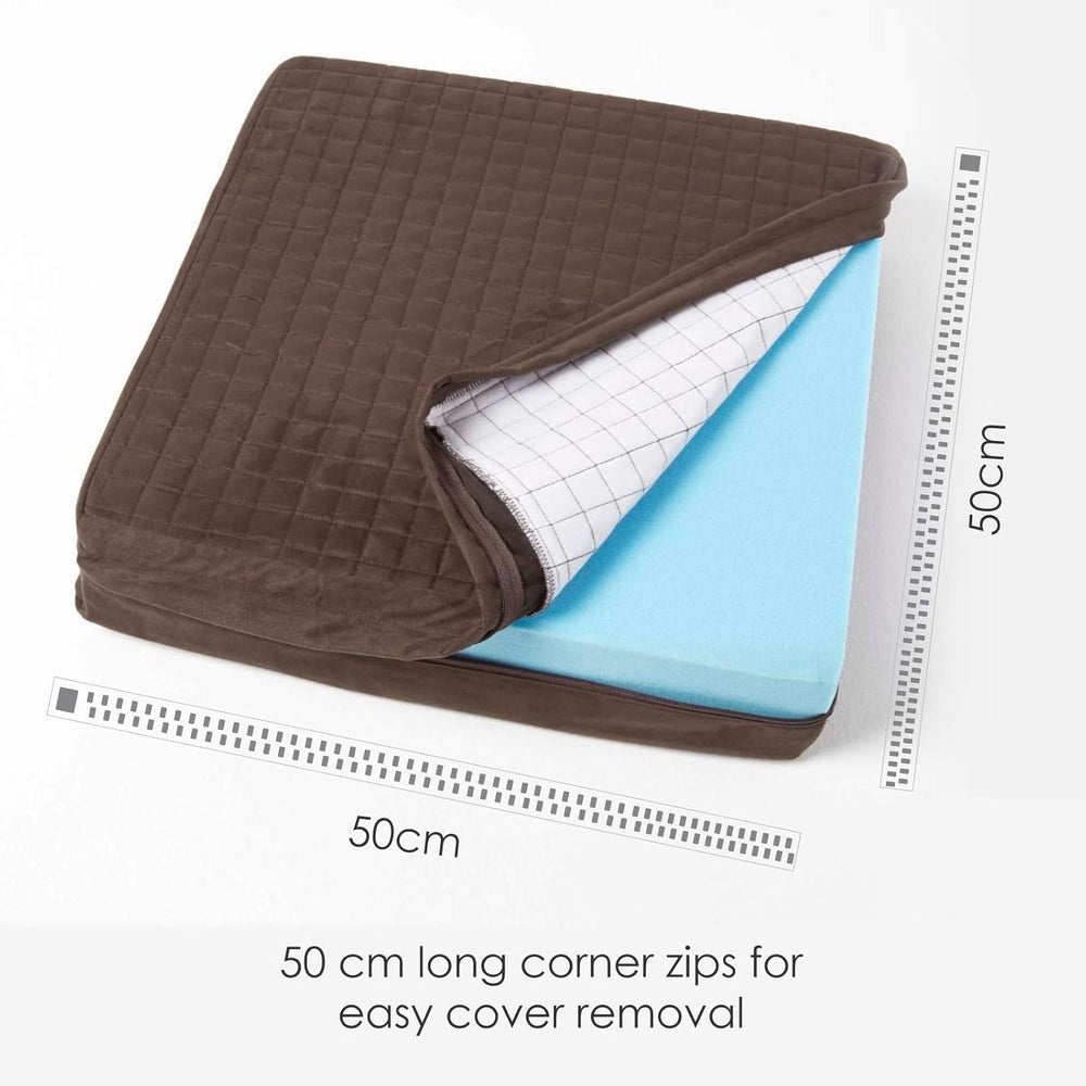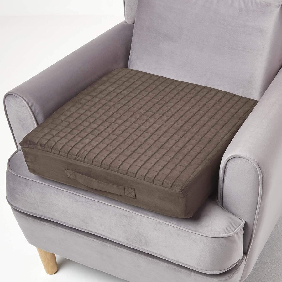 - Dick und fest gepolstertes Sesselkissen aus orthopädischem Schaumstoff mit abnehmbarem Velours-Bezug und praktischem Tragegriff. Grösse ca.: B 50 x T 50 x H 10 cm. Farbe: Braun.