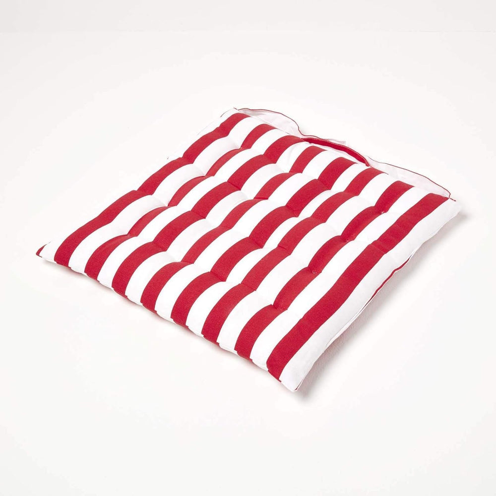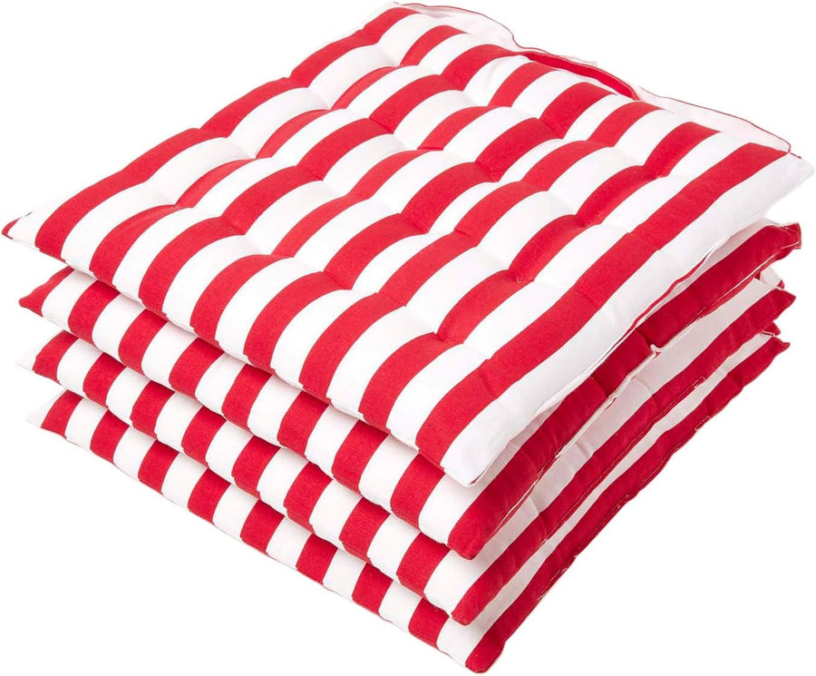 - Set aus 4 Sitzkissen mit Bändern und praktischem Knopfverschluss. Grösse: ca. 40 x 40 x 5 cm. Zweifarbig: rot-weiss gestreift.