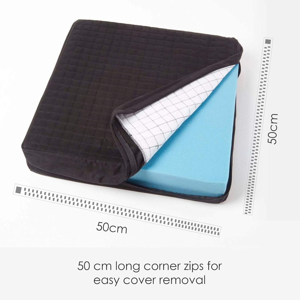 - Dick und fest gepolstertes Sesselkissen aus orthopädischem Schaumstoff mit abnehmbarem Velours-Bezug und praktischem Tragegriff. Grösse ca.: B 50 x T 50 x H 10 cm. Farbe: Schwarz.