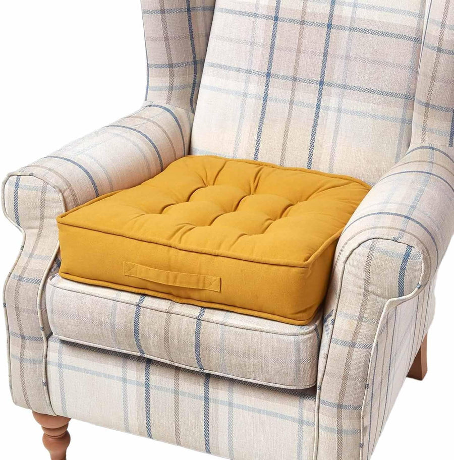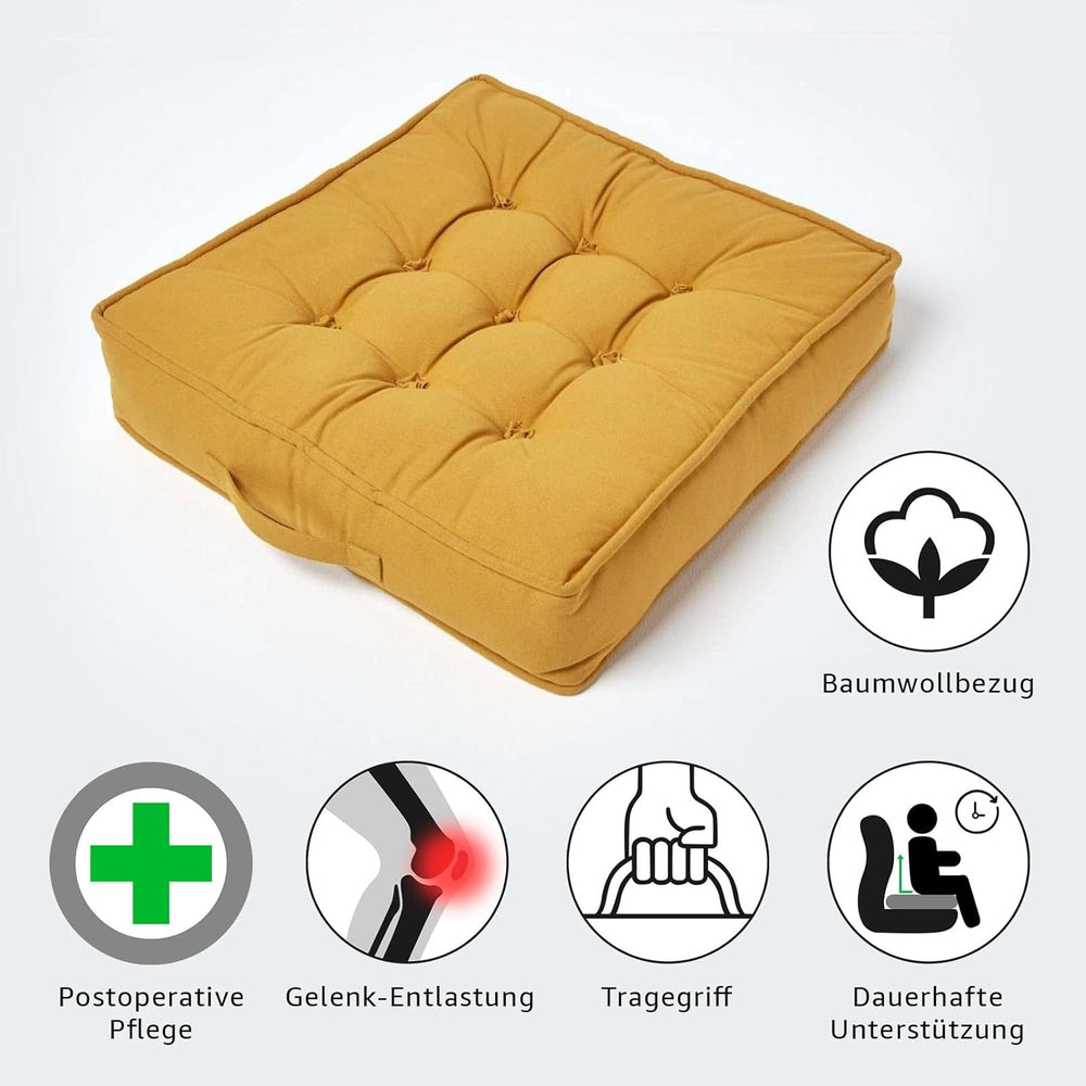 - Komfortabel und fest gepolstertes dickes Sitzkissen mit Tragegriff und gestepptem, weichem Baumwollbezug. Grösse ca.: B 50 x L 50 x H 10 cm. Farbe: Senfgelb.