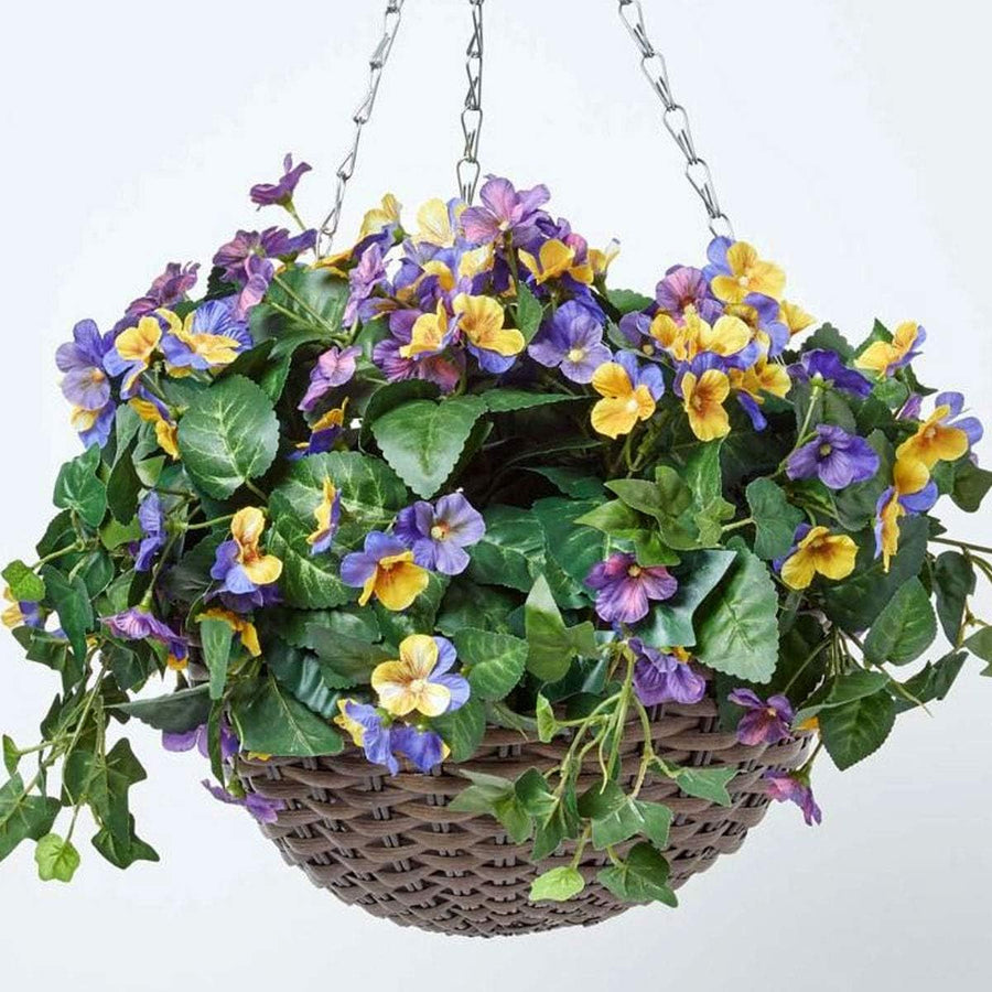 - Hängendes künstliches Stiefmütterchen mit Weidenkorb, Kette und Haken. Grösse ca.: H60 x B38 cm, Topf Durchmesser: 30 cm, Gewicht: 0,65kg. Farbe: lila und gelb