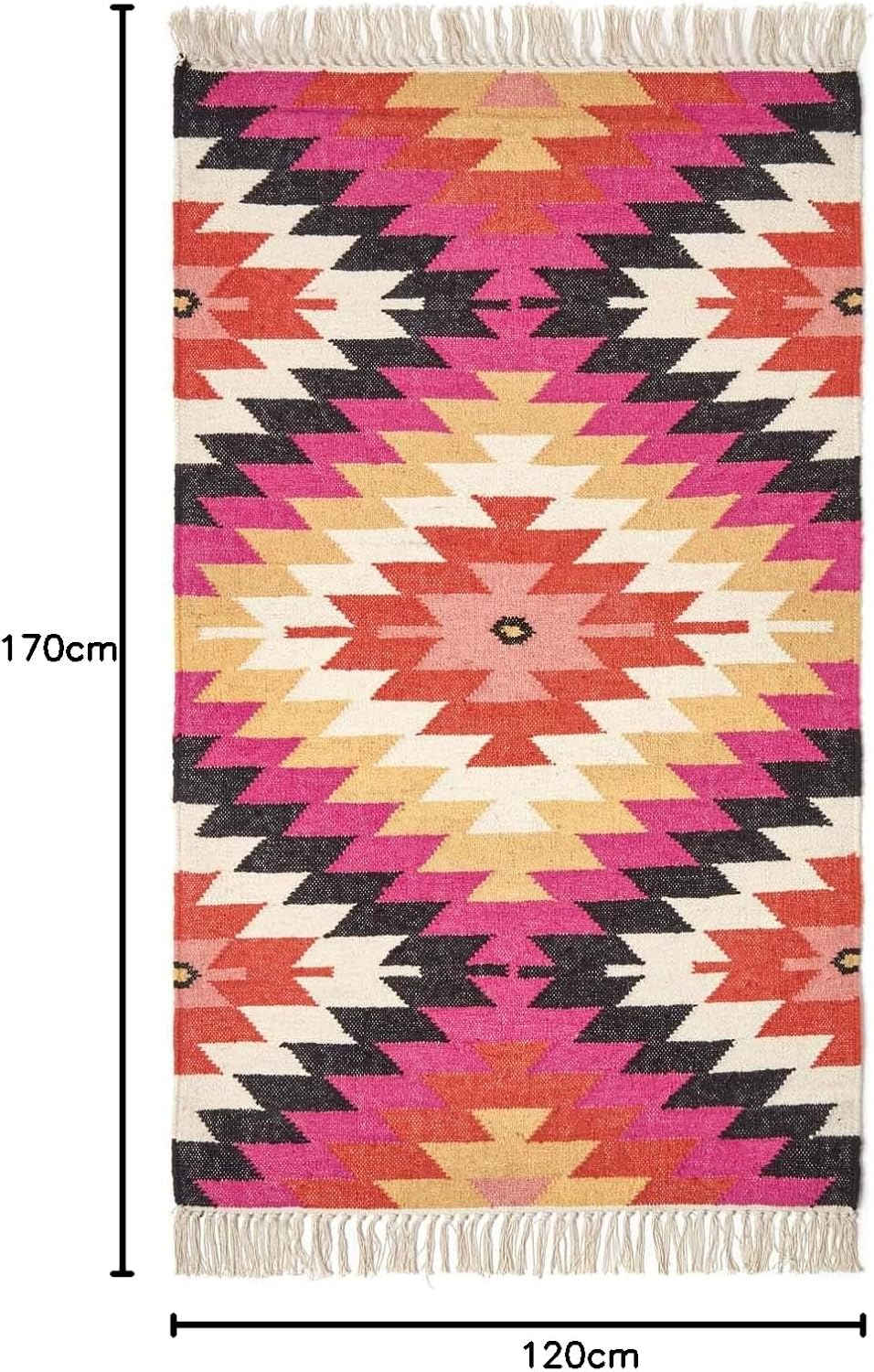 - Hochwertiger Wollteppich Jakarta mit traditionellen Mustern und verspielten Fransen. Grösse: ca. 120 x 170 cm. Mehrfarbig: pink, orange, schwarz, gelb, rot.