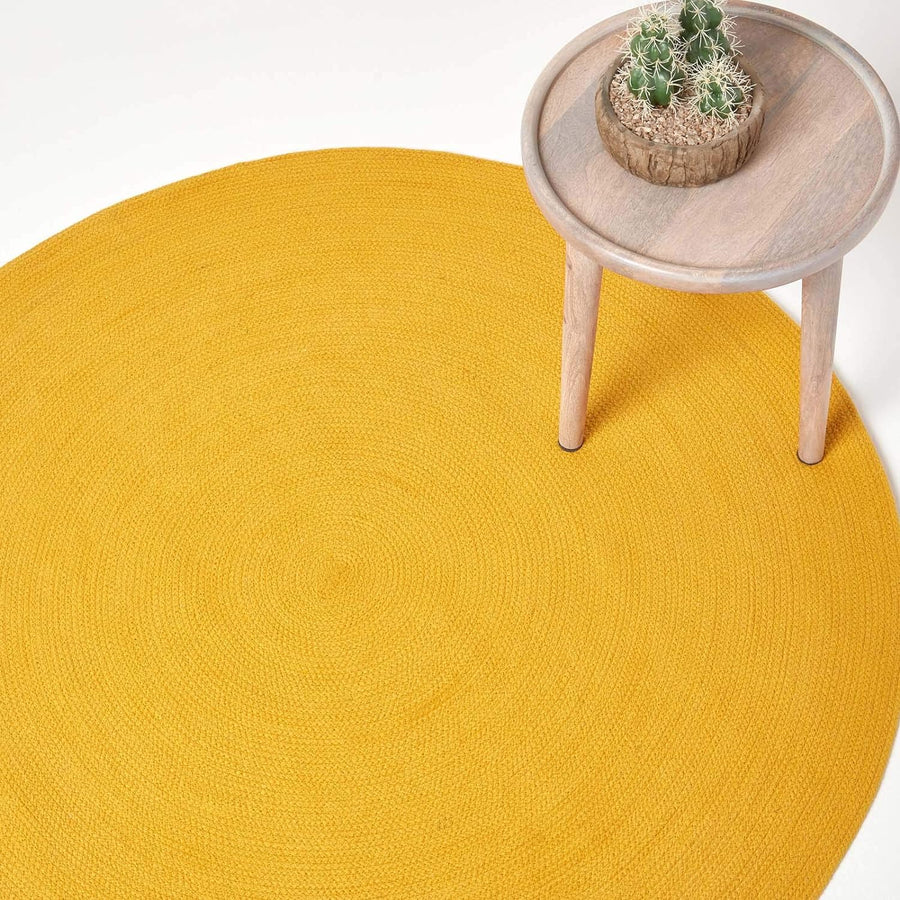 - Unifarbener Flechtteppich. Farbe: senfgelb, Durchmesser: ca. 120 cm.