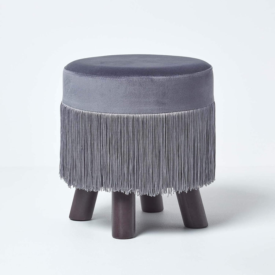 - Runder Retro-Samthocker Warwick mit Fransen und Holzbeinen. Grösse: ca. B32 x T32 x H35 cm, Farbe: hellgrau/silbergrau.