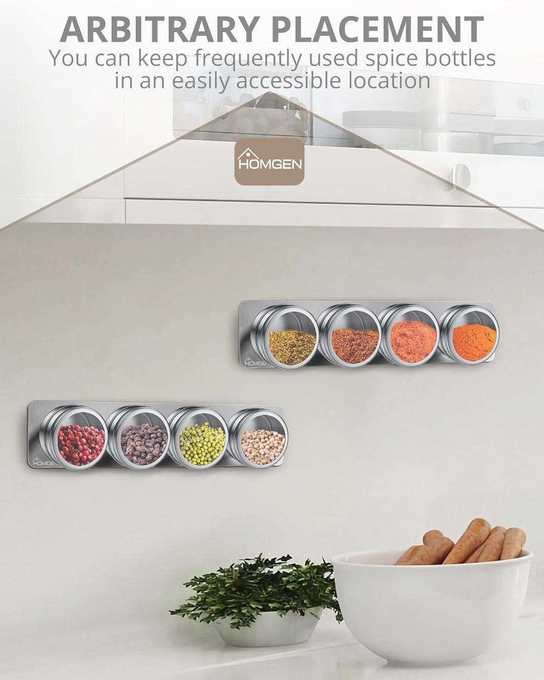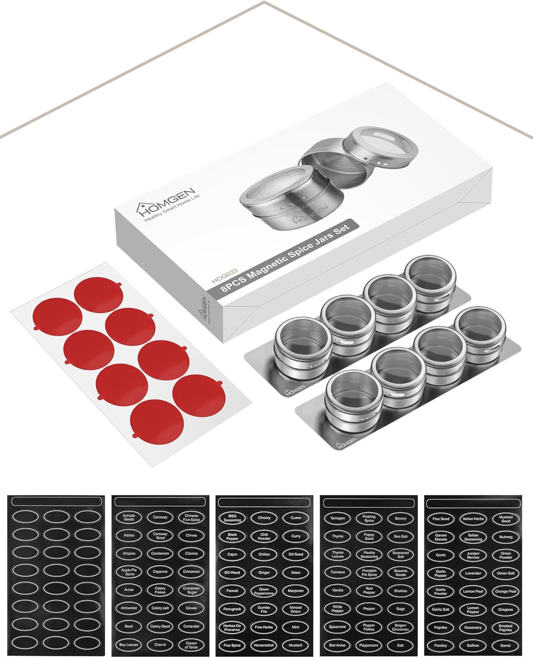 - 【Packungsinhalt】HOMGEN Gewürzdosen-Set enthält 8 magnetische Gewürzdosen, 2 Edelstahlböden, 5 Gewürzetiketten und 12 selbstklebende Klebeblätter. (Hinweis: Edelstahl-Bodenschale ist scharf, bitte mit Vorsicht verwenden)