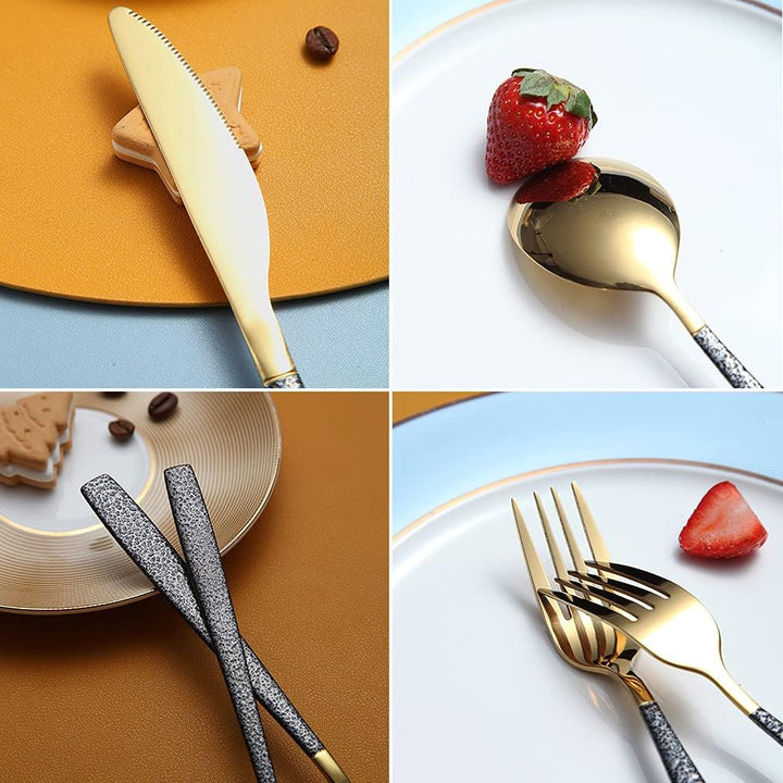 - Luxus und hochwertige Verarbeitung: Das Besteckset ist hochglanzpoliert und mit Titangold und schwarzem Marsgriff beschichtet. Sieht luxuriös und schön aus. Sie sind eine schöne Dekoration Ihrer Tischplatte und erhöhen Ihr Abendessen.