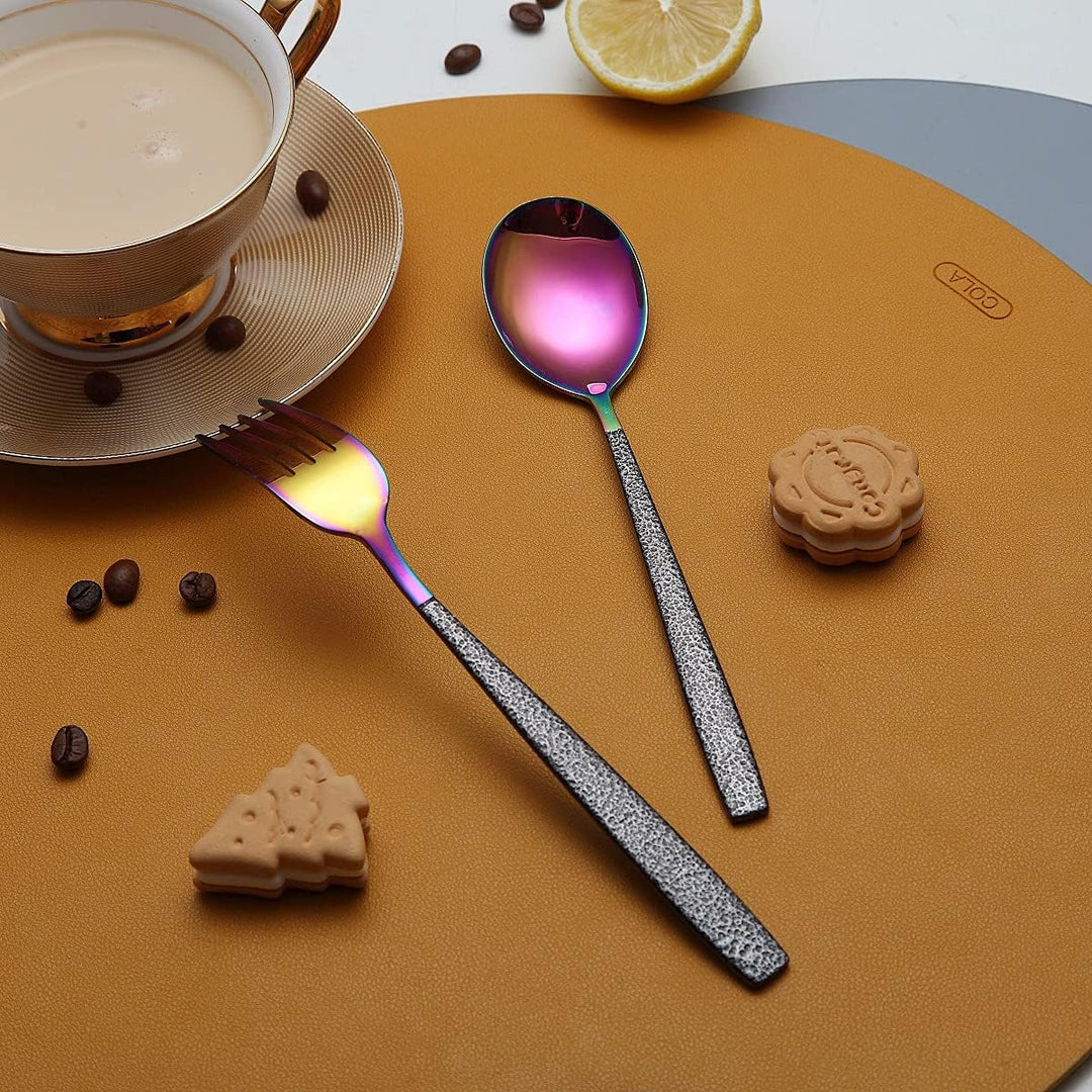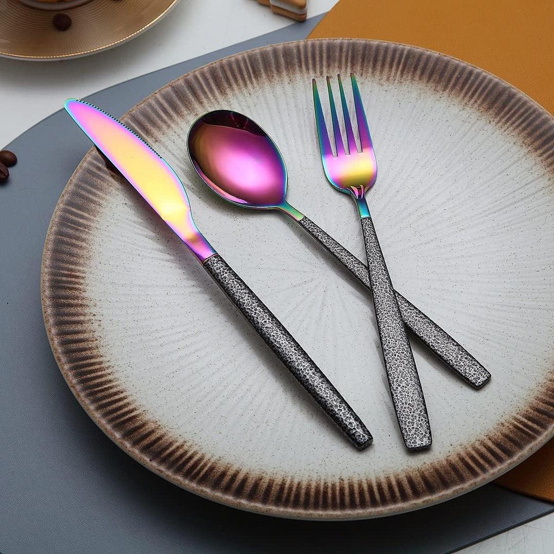 - Luxus und hochwertige Verarbeitung: Das Besteckset ist hochglanzpoliert und mit Titan Rainbow und schwarzem Marsgriff beschichtet. Sieht luxuriös und schön aus. Sie sind eine schöne Dekoration Ihrer Tischplatte und erhöhen Ihr Abendessen.