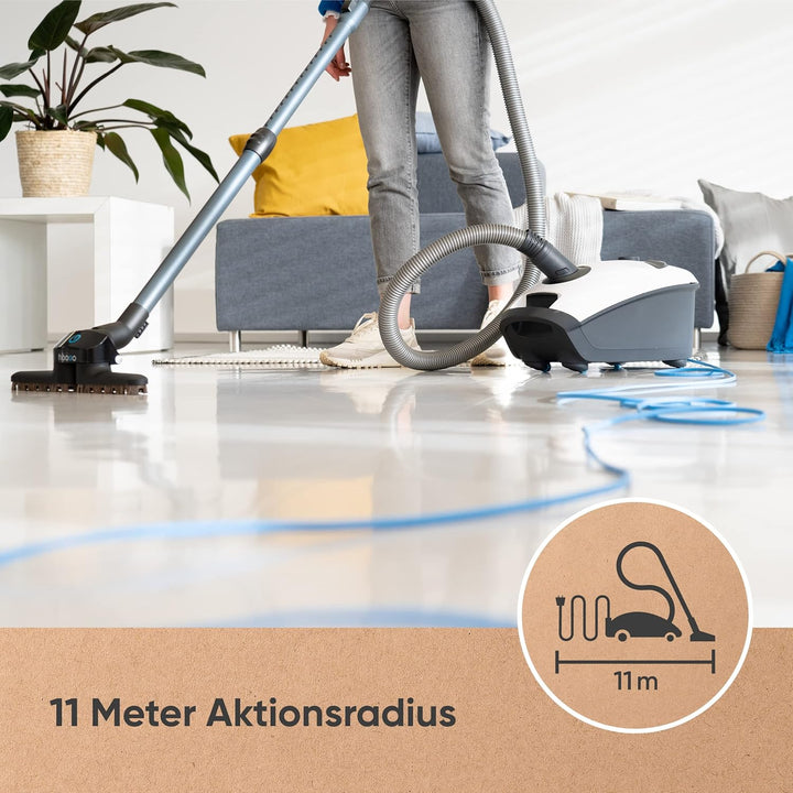 - GROssE REICHWEITE – Das 8m lange Kabel schafft einen weiten Aktionsradius von 11m. Dank des Teleskoprohrs und dem Komfort-Fahrwerk können alle Winkel in grossen Räumen erreicht werden.