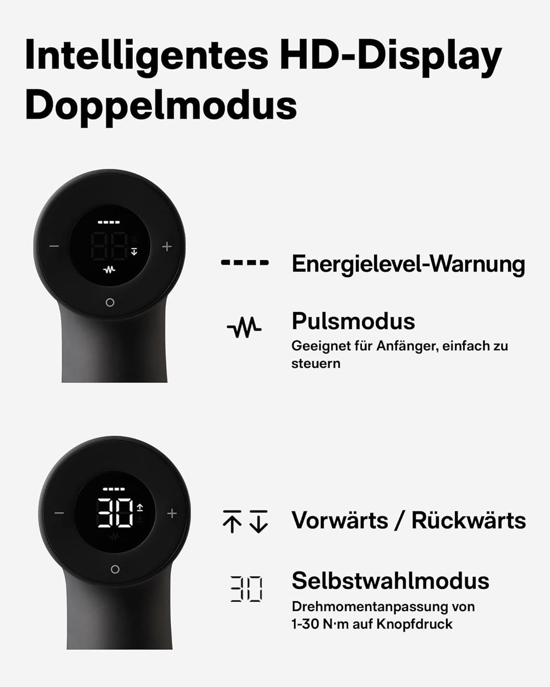 - [Selbstwahl Modus & LED Bildschirm] Digitale Drehmoment, neu intelligent interaktiv einzustellen. Mit intelligentem Bildschirm kann 30 Stufen, Batterieleistung, Dual-Modi, Vorwärt und Rückwärt anschaulich angezeigt werden. 30 Nm Drehmoment, kann genau