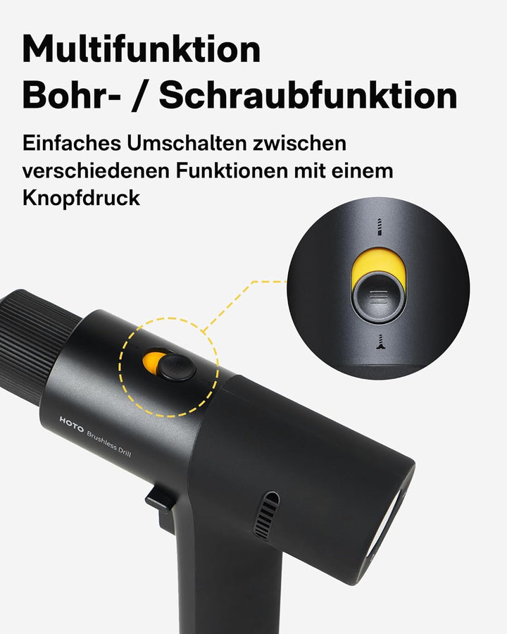 - [Puls Modus] Beim Puls Modus ist die intermittierende Ein-und Ausschalten der HOTO Akku Bohrmaschine durch den intelligenten Chip zu realisieren, um die Sicherheit der Nutzer zu gewährleisten. Geeignet für Einsteiger und Profis