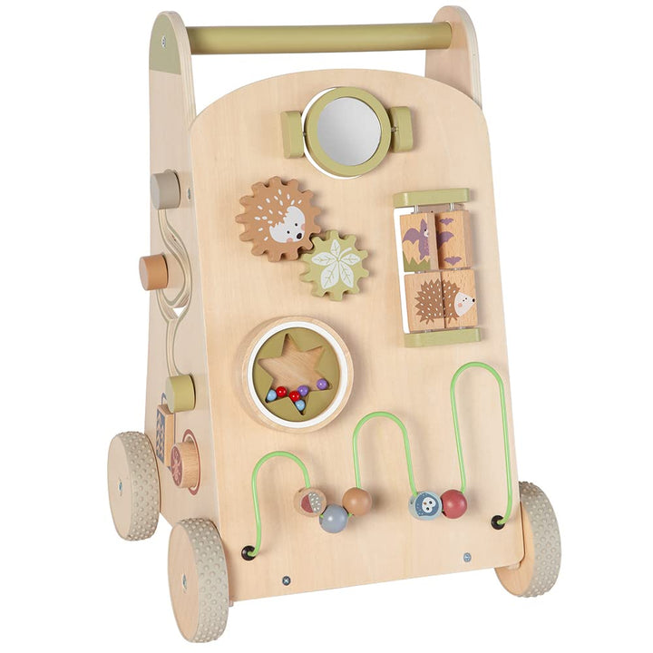 • Das vielseitige Motorikspielzeug aus Holz bietet viele Spielelemente wie: Zahnräder, Motorikschleife, drehbares Puzzle, Murmelrad, Spiegel, Steckpuzzle und Fenster zum Öffnen und fördert somit motorische Fähigkeiten, Sehsinn und Geschicklichkeit.