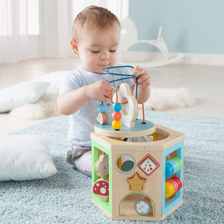 • Der Motorikwürfel jede Menge Möglichkeiten, um sich spielerisch auszutoben: Rassel, Steckwürfel, Schiebeelement zum Zuordnen von Farben, jede Menge drehbare Holzdetails und eine Motorikschleife.