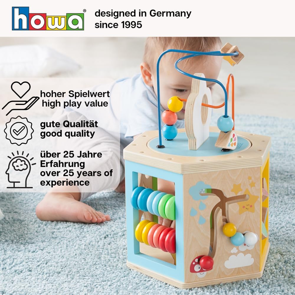 • howa Motorikspielzeug aus Holz mit 6 vielfältig bespielbaren Seiten und liebvoller Gestaltung.