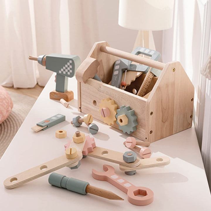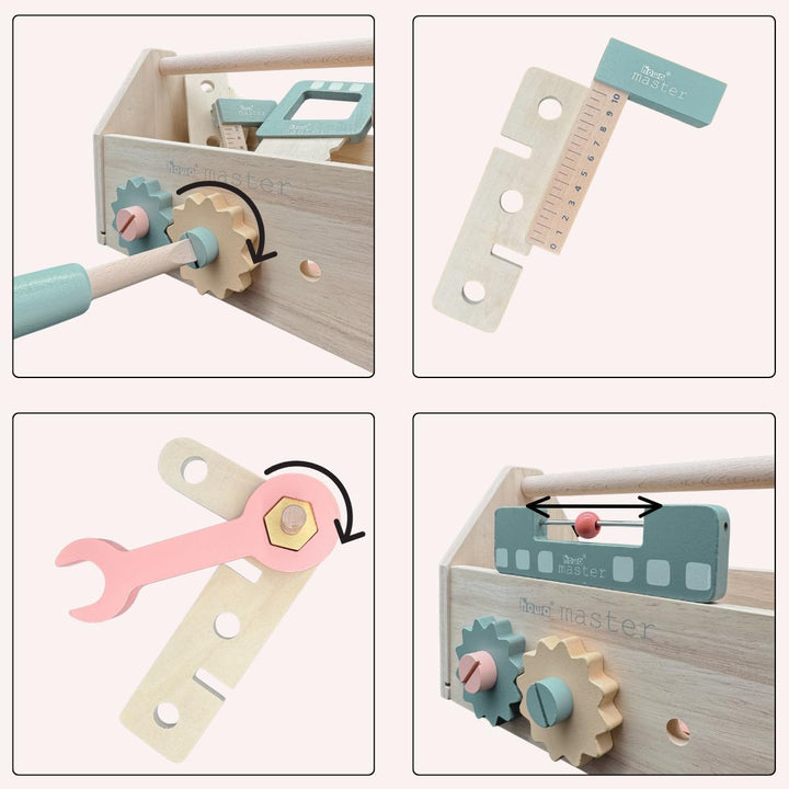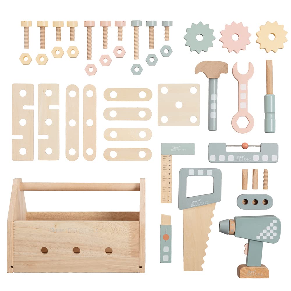 • Kinderwerkzeugkiste mit 32 teiligem Zubehörset mit Schrauben, Muttern, Zahnrädern, Holzteile mit Bohrungen