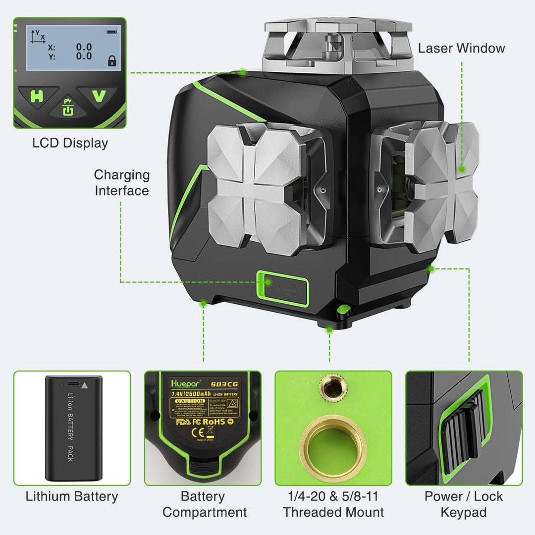 - DREI METHODEN VON ENERGIEVERSORGUNG & TYP-C LADEANSCHLUSS: Dieses 360° Laserwerkzeug mit 7.4V / 2600mAh Li-Ionen-Akku (kann leicht auf dem lokalen Markt gekauft werden) oder mit 4 AA Alkaline Batterien ist geeignet für längere Laufzeit. Ausserdem kann
