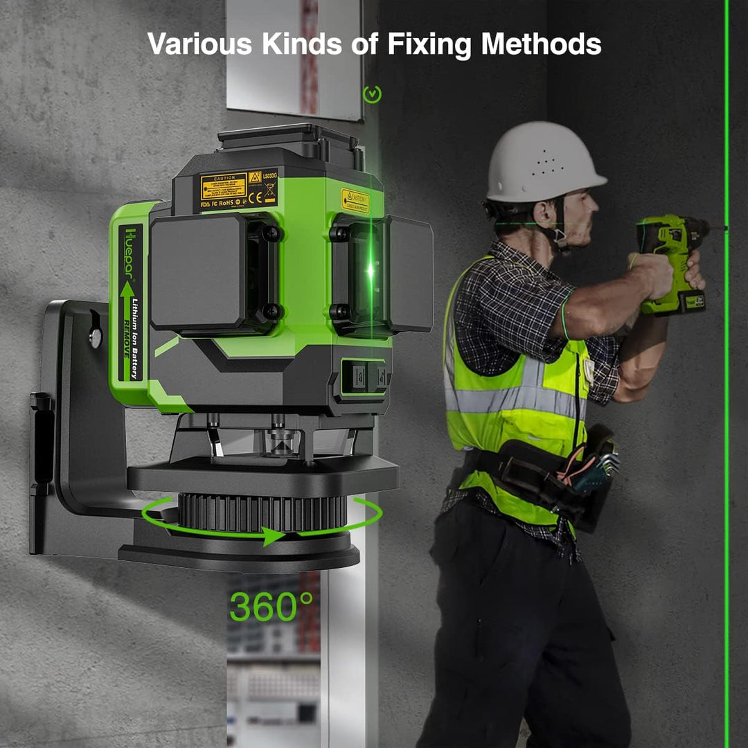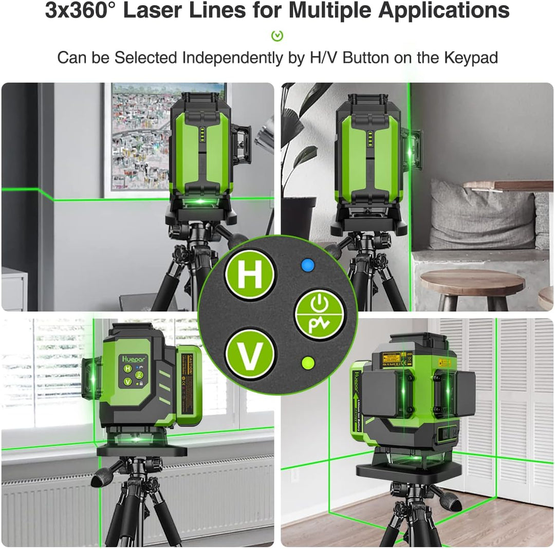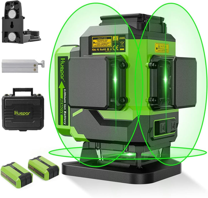 - Huepar 3 x 360 Kreuzlinienlaser Grün 3D Grad Linienlaser Selbstnivellierend und Ausrichtung Fliesenboden Laserwerkzeug, 2 Li-Ionen-Batterien mit Typ-C-Ladeanschluss und magnetischer Halterung LS03DG