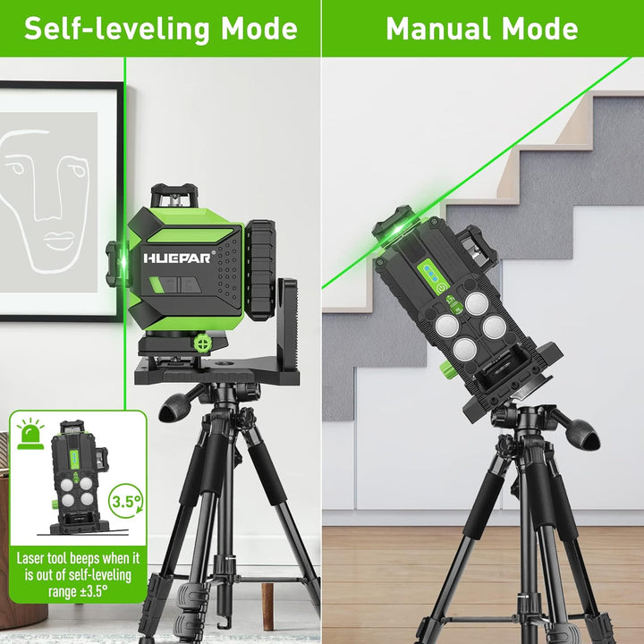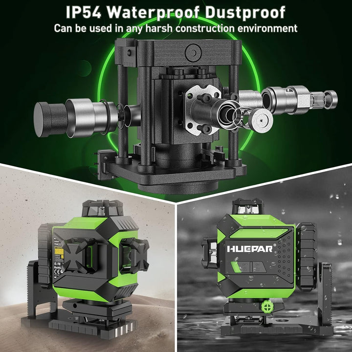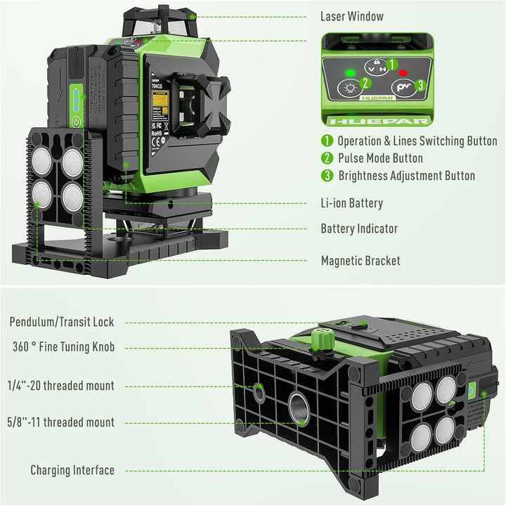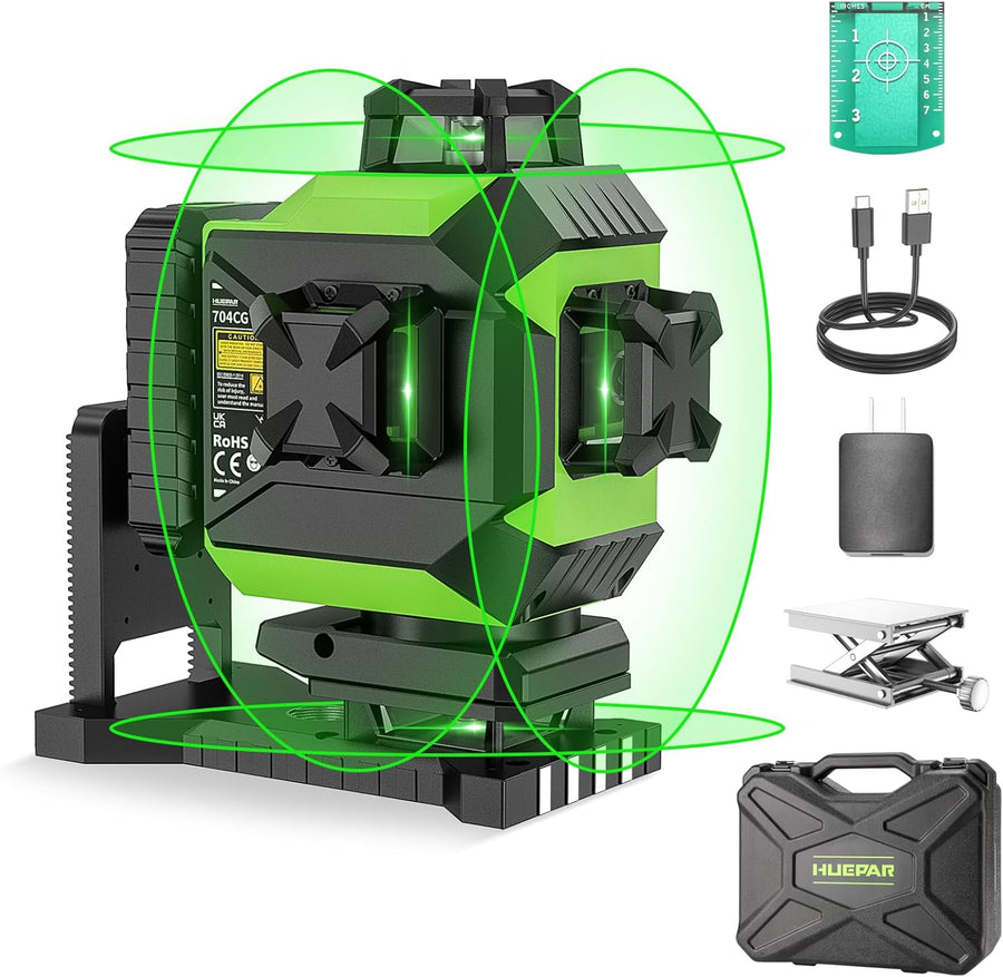 - 4 X 360° GRÜNE LASERLINIEN: Huepar 704CG pro Lasernivellier mit 2 horizontalen 360° Ebenen. Die obere horizontale 360°-Linie kann für die Deckenmontage verwendet werden. Die untere horizontale 360°-Linie kann für die Verlegung von Fliesen