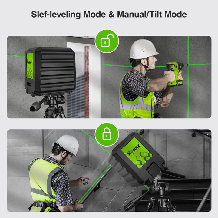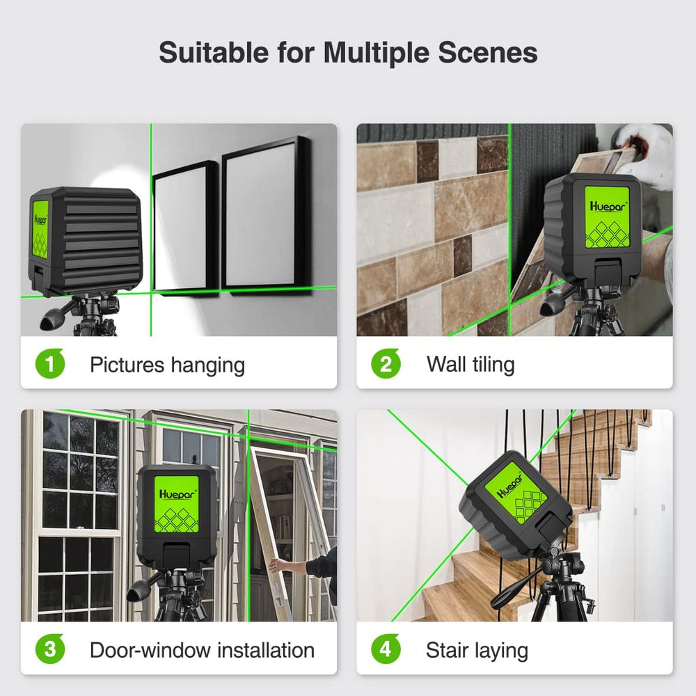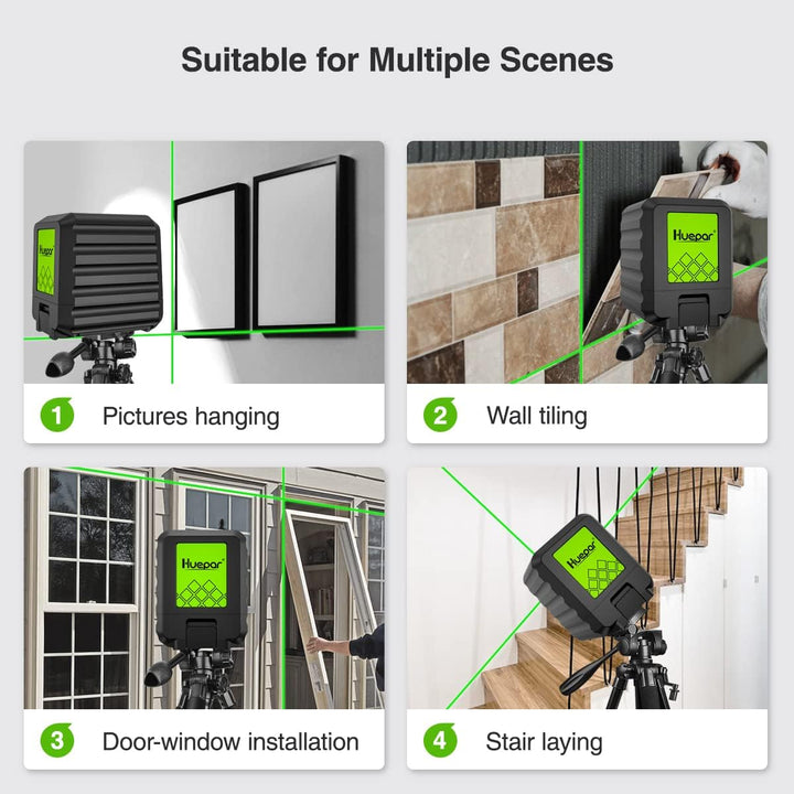 • GRÜNE KREUZLASERLINIEN: Huepar Kreuzlinienlasernivellier nehmen fortschrittliche osram grüne Lasertechnologie an. Grüner Laser ist 2-mal heller als roter Laser mit der gleichen Lichtquelle. Zwei hellgrüne Kreuzlinienlaser sind klar und scharf,