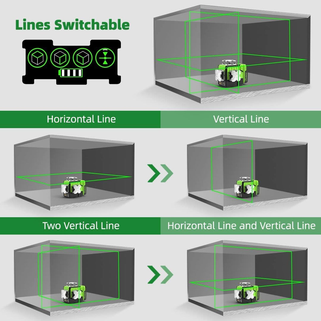 - 3x360° UMFASSENDE LASERWERKZEUG: Huepar Lasernivellier haben eine horizontale 360° Ebene, zwei vertikale 360° Ebenen, 12 Laserlinien, die den Boden, die Wände und die Decke im ganzen Raum abdecken können. Jede Taste auf diesem Lasernivellier