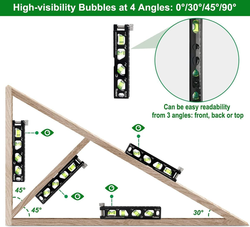 - 4 LIBLLEN: Torpedo Wasserwaage mit gut ablesbarem, sichtbarem Blasen in 4 Winkeln: 0°/30°/45°/90°. Diese Libellen haben eine Genauigkeit von 0,5 mm / m und können verwendet werden, um klare und genaue Messungen durchzuführen. Grosse, auf der