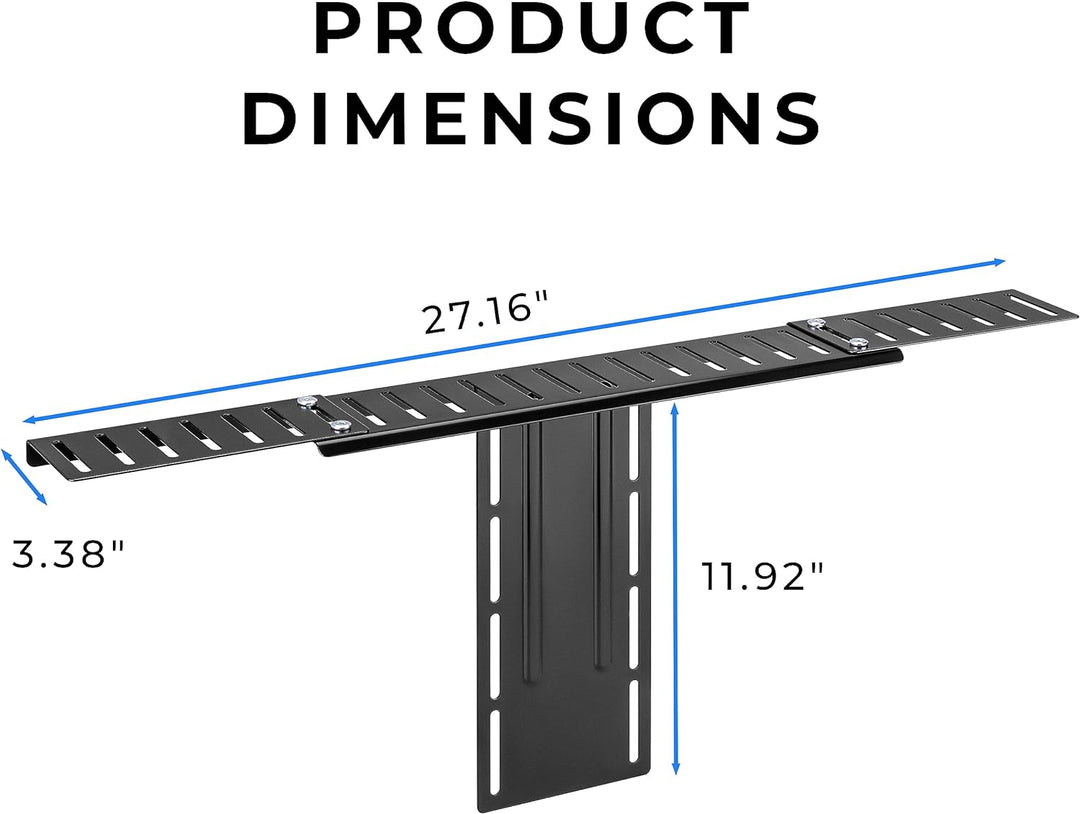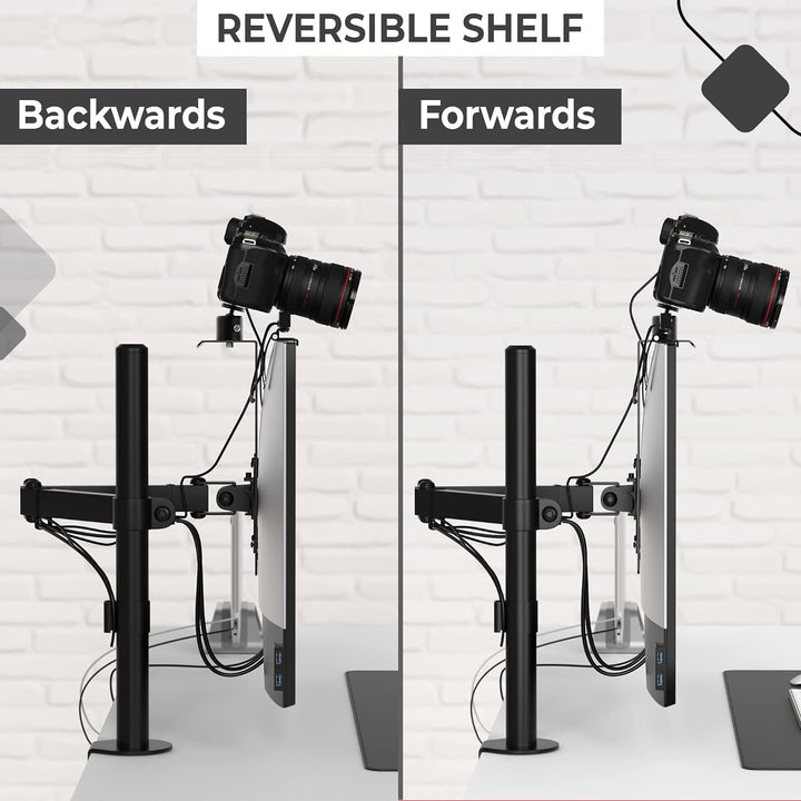 - Bleiben Sie organisiert und führen Sie Kabel durch das Regal hinter Ihrem Bildschirm. Sichern Sie Ihr Zubehör in der Mitte Ihres Schreibtischs, ohne dass grosse Stangen, Ausleger oder Arme Ihren Platz überfüllen. Masse des kleinen Regals: 12,5 cm