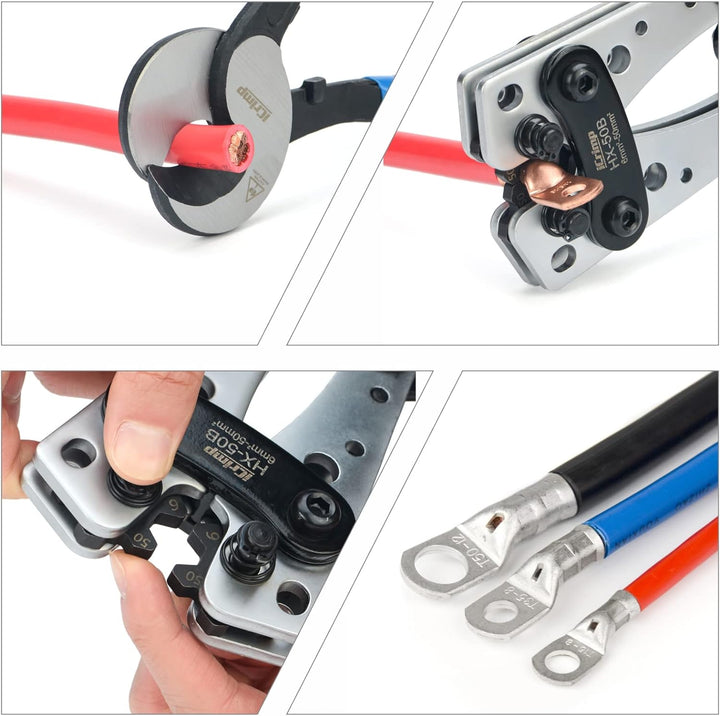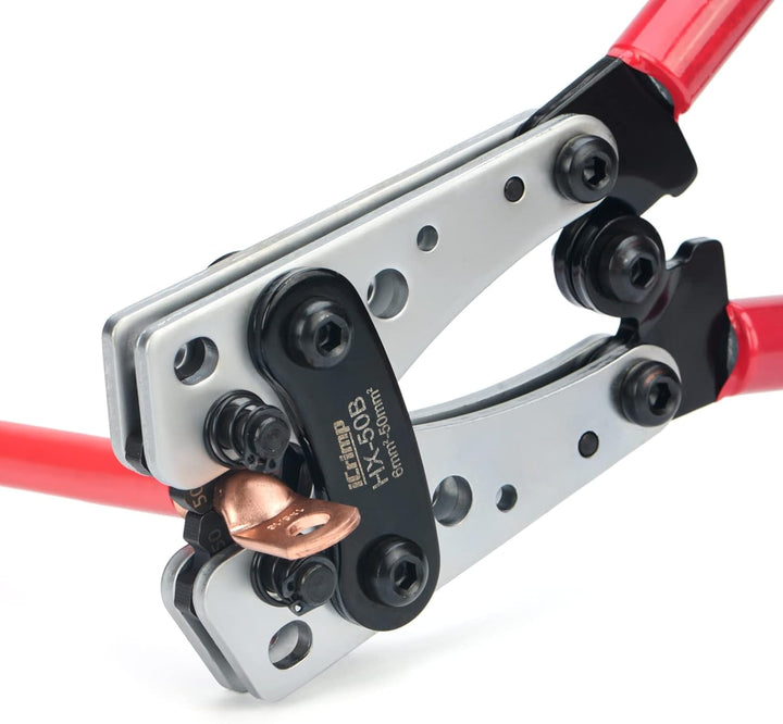 - 【ZWECK】HX-50BI Batteriekabelschuh-Crimper ist zum Crimpen von 6/10/16/25/35/50 mm² Batteriekabelschuhen konzipiert, wodurch eine sichere Verbindung mit Kabeln, elektrischen Geräten und anderen Strommechanismen in rauen Umgebungen besteht.