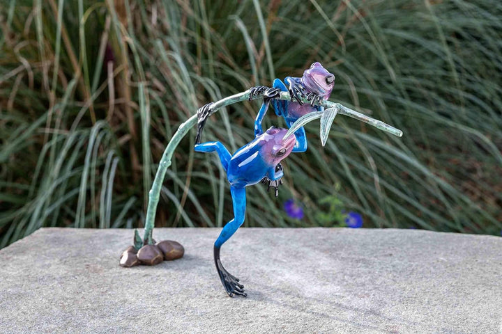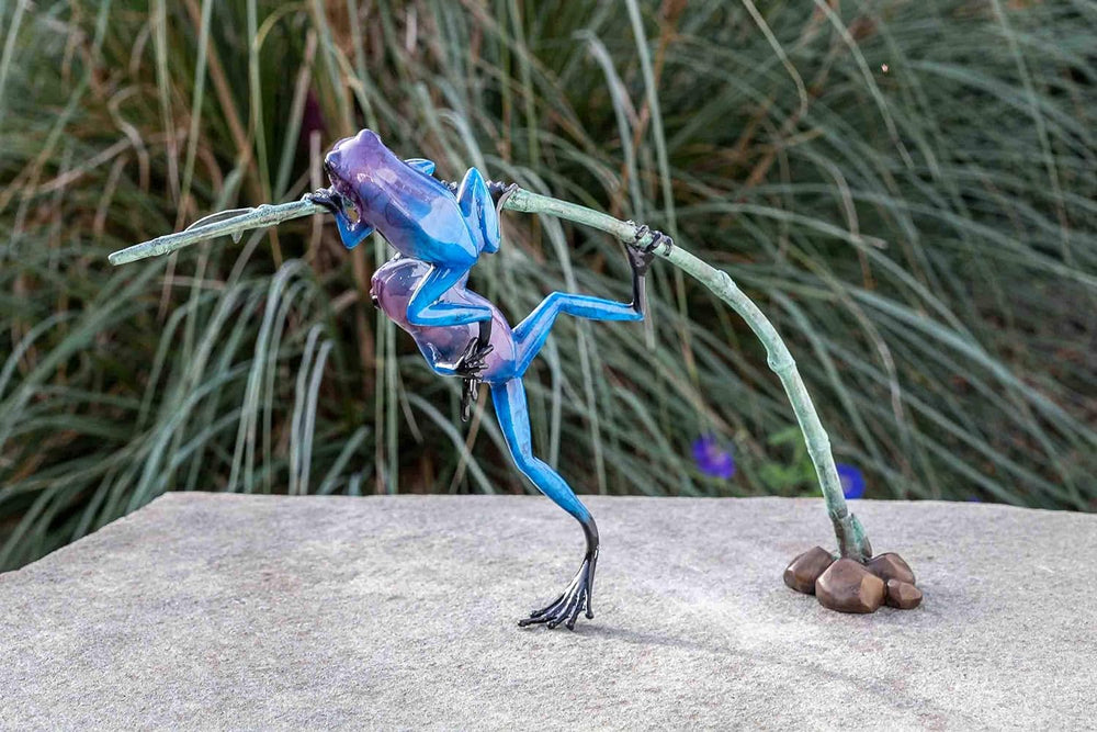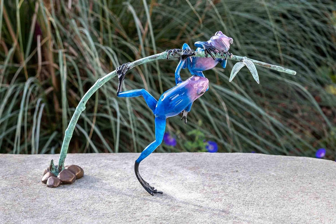 IDYL Bronze-Skulptur Zwei blaue Frösche auf einem Ast | 15x10x32 cm | Tierfigur aus Bronze handgefer