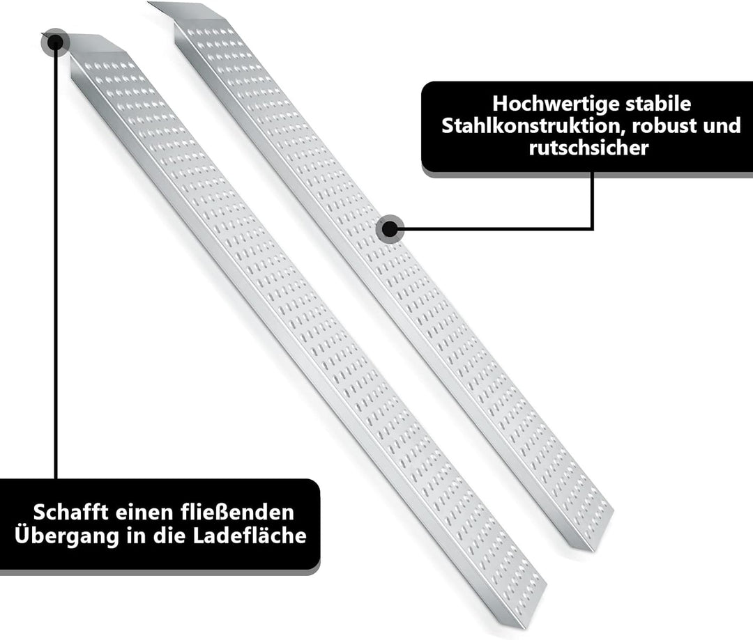 - ✅ Die Rampe verfügt über eine rutschfeste, perforierte Oberfläche, die dem Fahrzeug einen besseren Grip verleiht. Die verzinkte und breite Oberfläche bietet dem Fahrzeug eine starke Stütze, sodass es einfach und sicher auf und ab fahren kann.