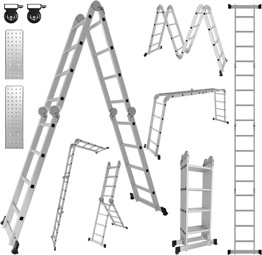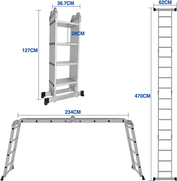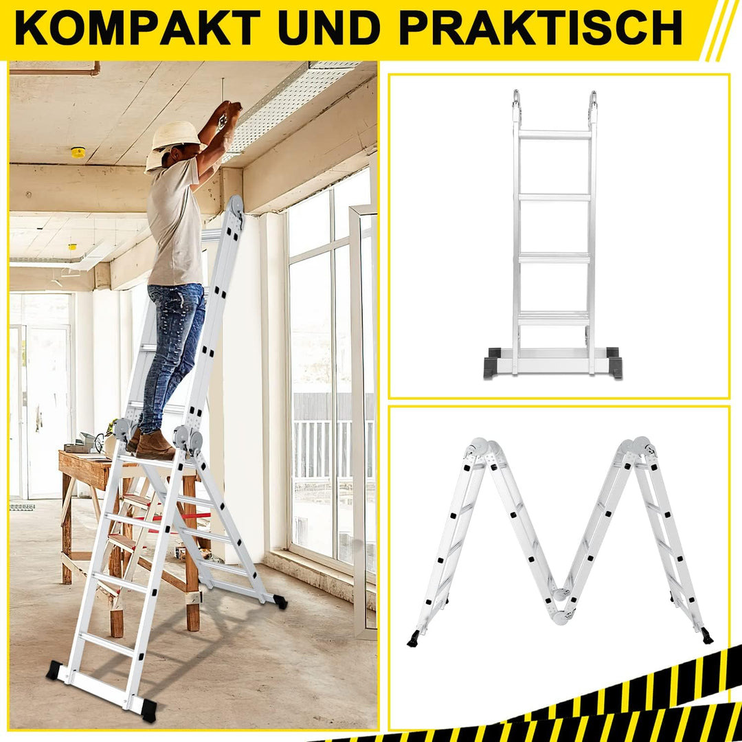 - 🔥470cm Mehrzweckleiter mit 2 Plattformplatten: Leiter aus robustem Aluminium mit bis zu 150 kg belastbar. Flexible Leiter für Arbeiten auf Treppen oder unebenen Oberflächen.