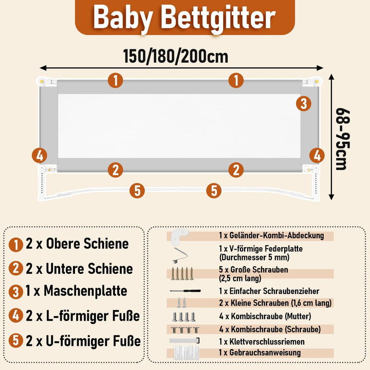 • 【Klappbares Bettgitter, höhenverstellbar】Das Kinderbettgitter ist in 150/180/200 cm, in drei Grössen erhältlich. Die Höhe der Gitter kann flexibel zwischen 68 und 95 cm eingestellt werden, so dass sie für verschiedene Bettgrössen geeignet sind