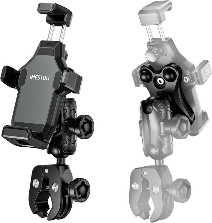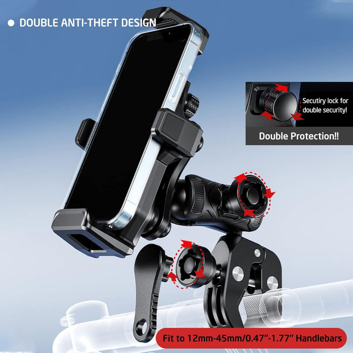 - [Einhändige Bedienung] Kippen Sie das Telefon, um den oberen Klemmarm des Anti-Vibrations-Motorrad-Telefonhalter zu drücken, das Element automatisch sperrt Ihr Telefon fest an Ort und Stelle; drücken Sie den Arm wieder, das Fahrrad