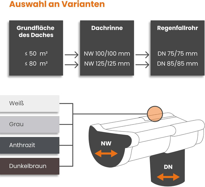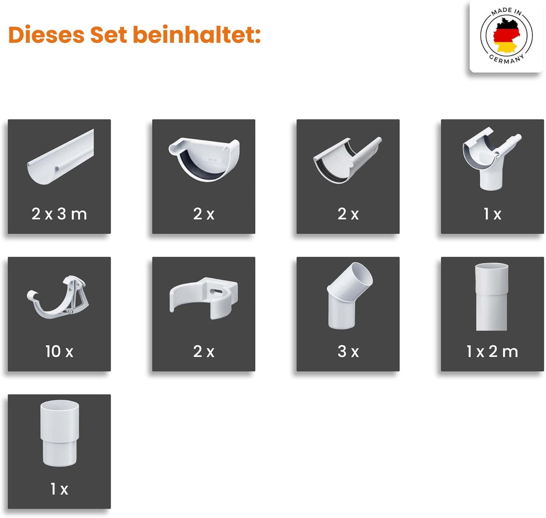 - KOMPLETT-LÖSUNG: Regenrinnen Set aus Kunststoff inkl. aller notwendigen Einzelteile wie Ablaufstutzen, Fallrohre oder Rinnenverbinder. Alle Teile sind einzeln nachbestellbar