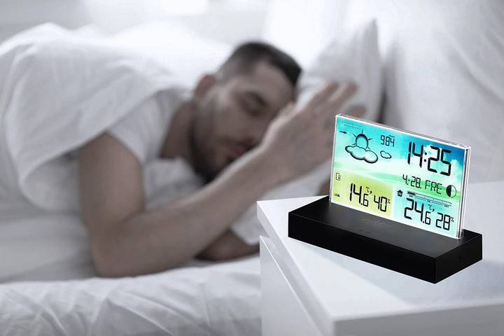 - Rahmenloses LCD-Display mit buntem Hintergrund • 2 Weckzeiten einstellbar • Anzeige der Temperatur wahlweise in °C / °F • Speichert Maximal- und Minimalwerte für Temperatur und Luftfeuchtigkeit • Temperaturwarnung mit einstellbaren Grenzwerten