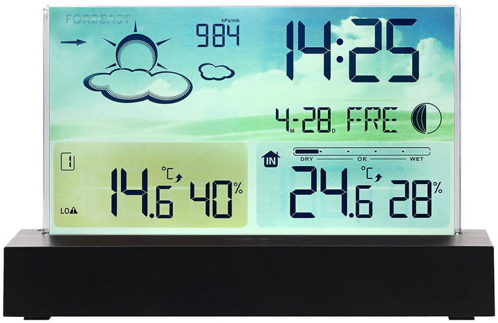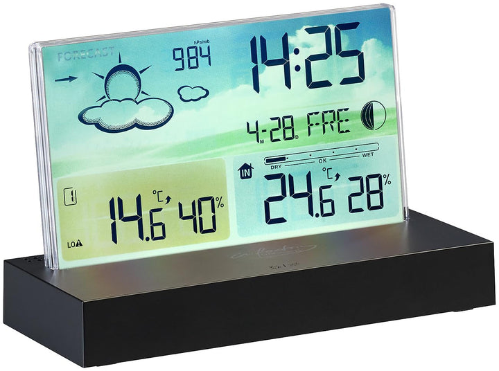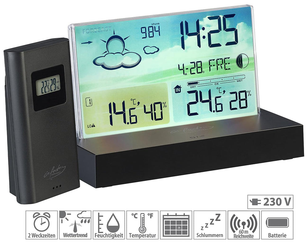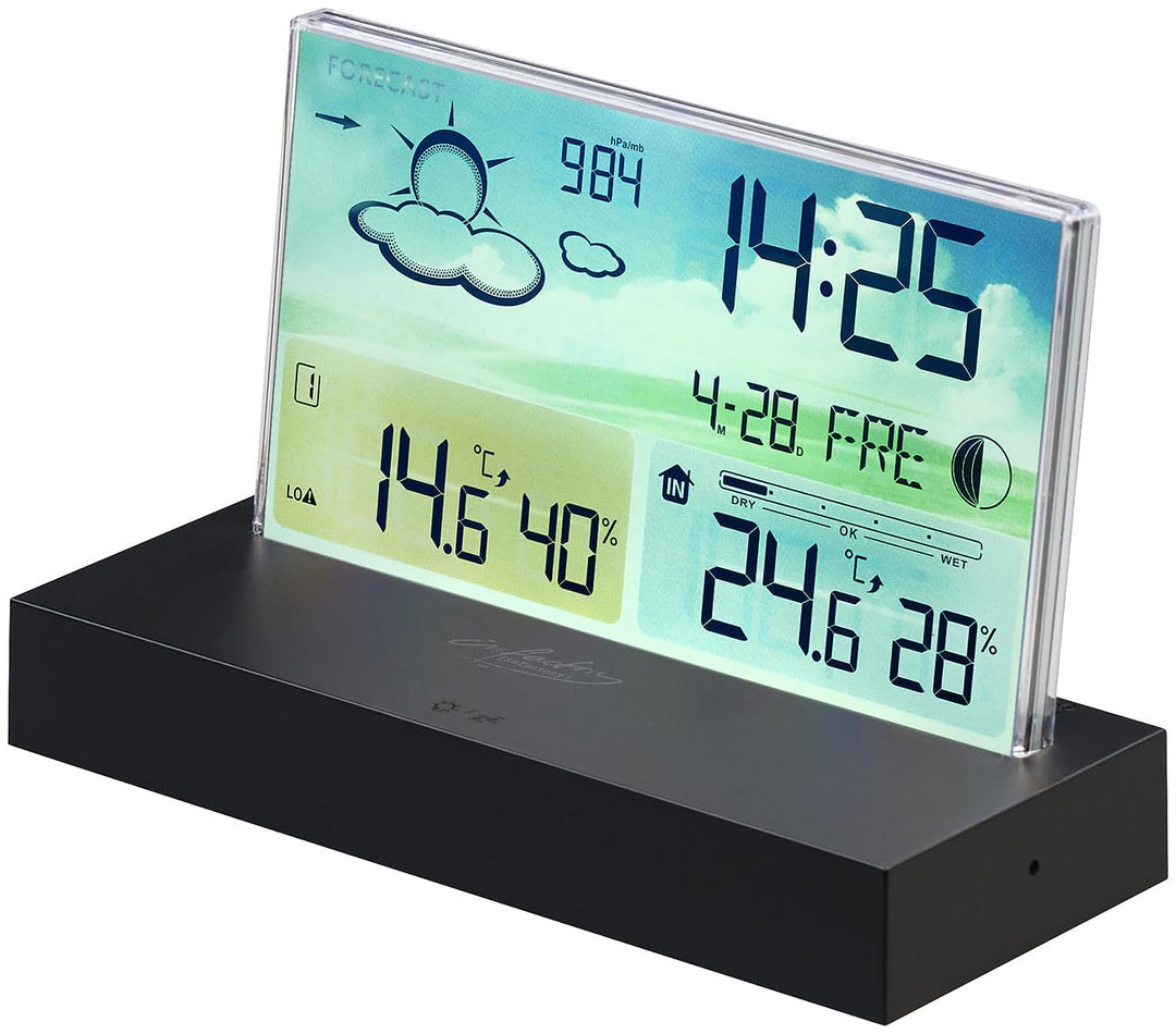- Einzigartiges Design dank rahmenlosem LCD-Display mit buntem Hintergrund • Thermometer und Hygrometer mit Wettertrend-Anzeige • Funk-Aussensensor mit bis zu 60 m Reichweite, erweiterbar um 2 Sensoren • DCF-Funkuhr mit bis zu 2 Weckzeiten •
