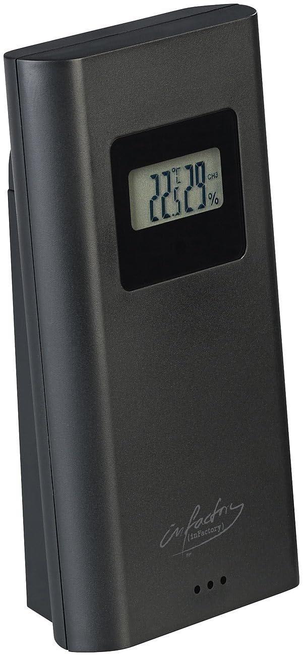 - Funkgesteuerte DCF-Zeitanzeige im 12- und 24-Stundenformat mit manueller Einstelloption • Funk-Aussensensor mit bis zu 60 m Reichweite, erweiterbar um 2 Aussensensoren (bitte dazu bestellen) • Messbereich relative Luftfeuchtigkeit: 20 bis 95 % •