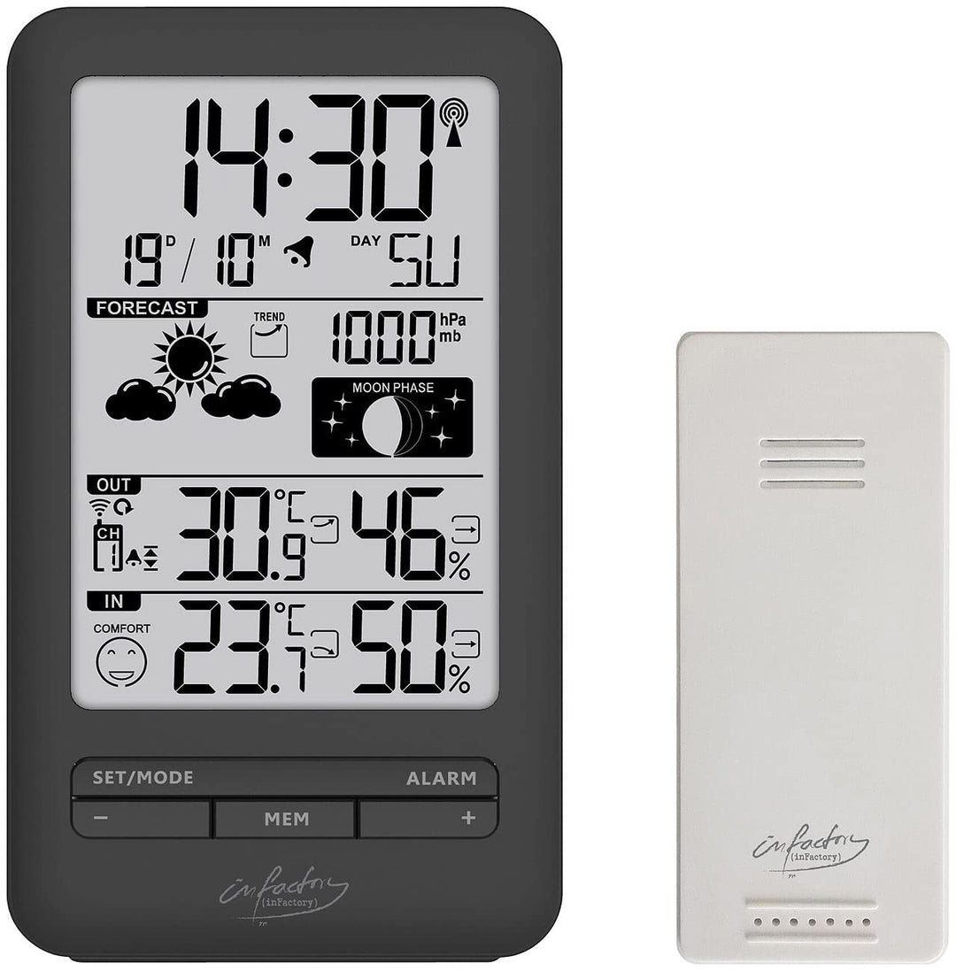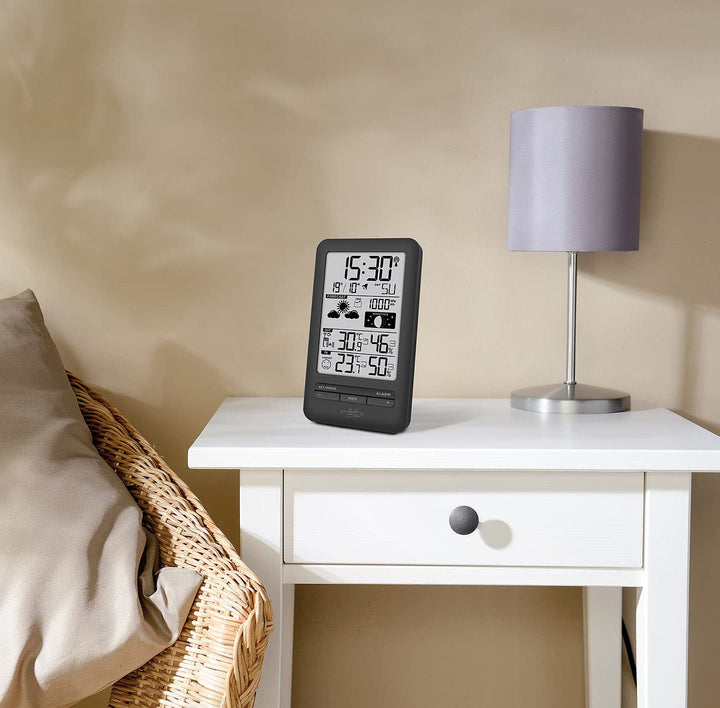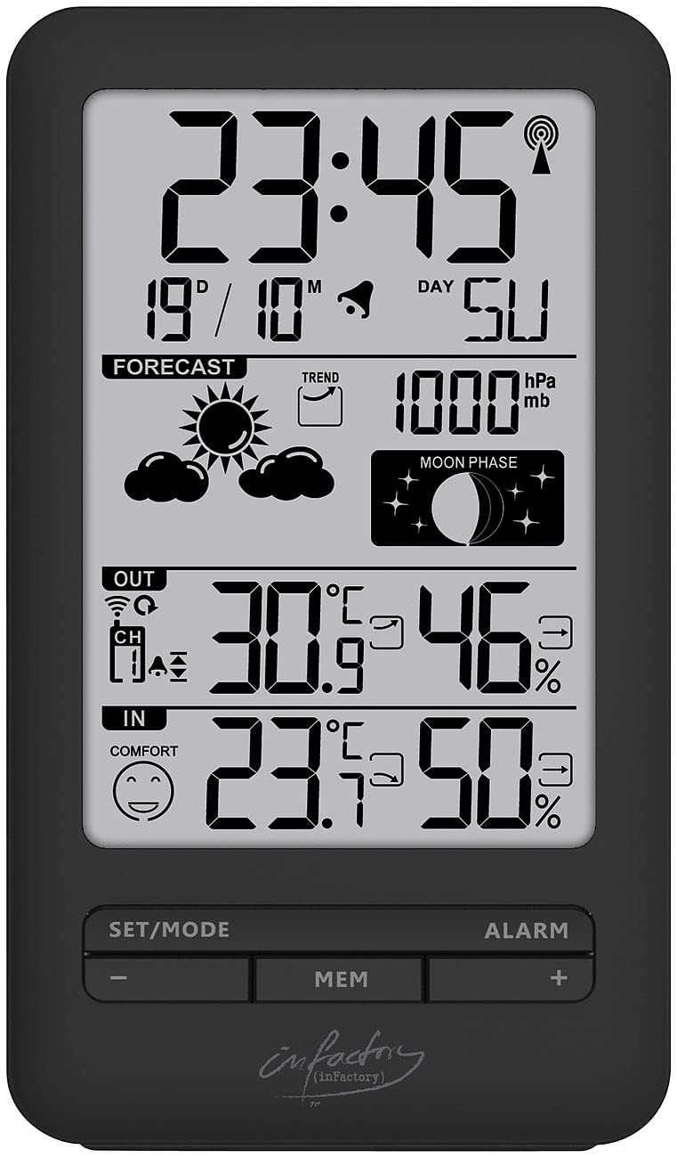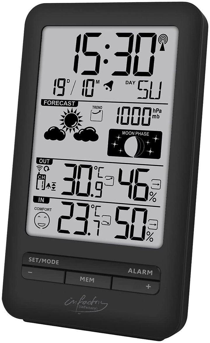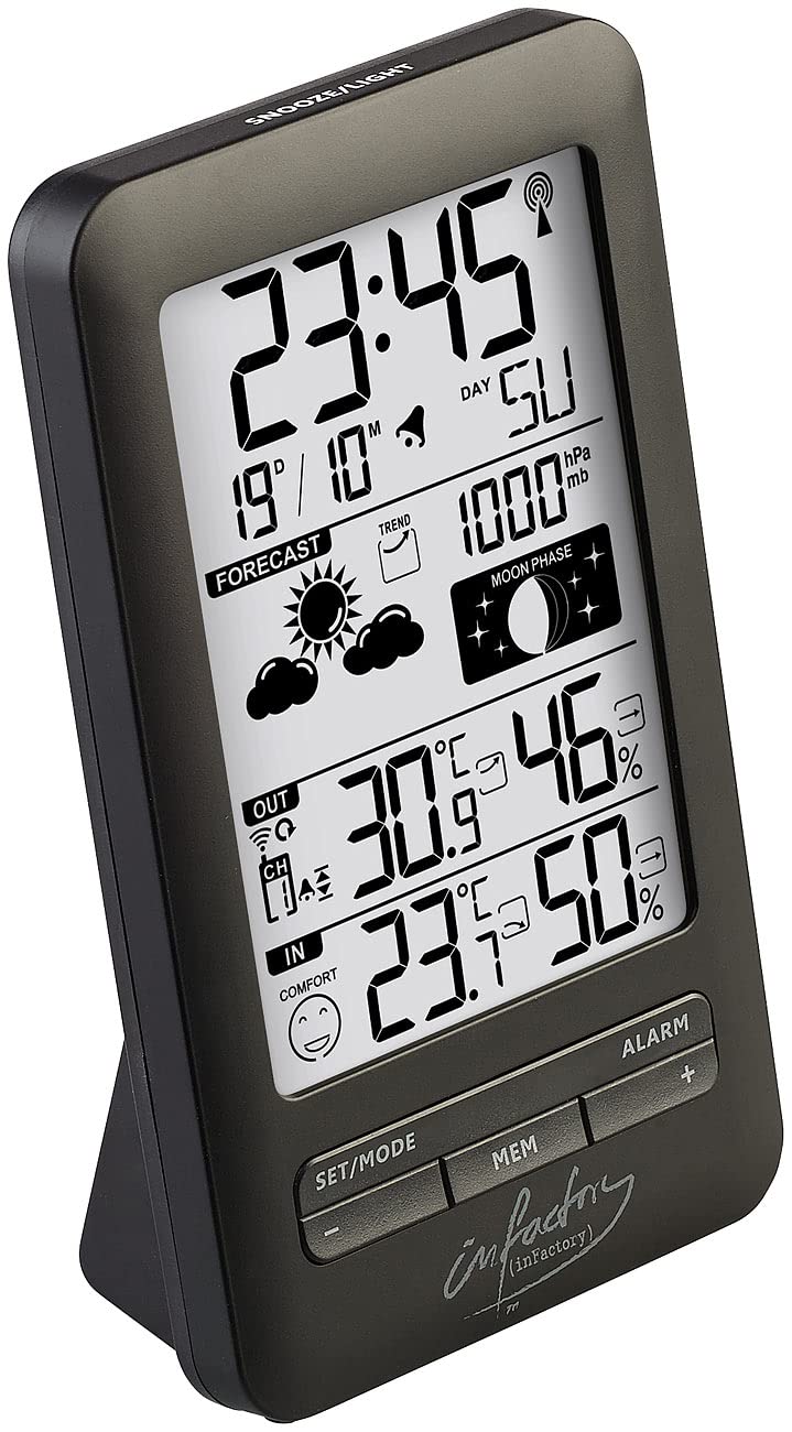 - Zeigt Temperatur und Luftfeuchtigkeit für innen und aussen • Luftfeuchtigkeit-Komfortanzeige für den Innenbereich • Integriertes Barometer für 12-Stunden-Wetterprognose • Kalender- und Mondphasen-Anzeige • Anschluss für bis zu 3