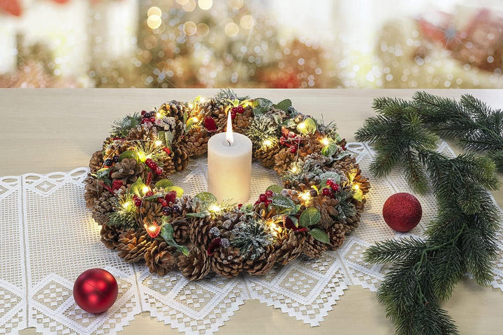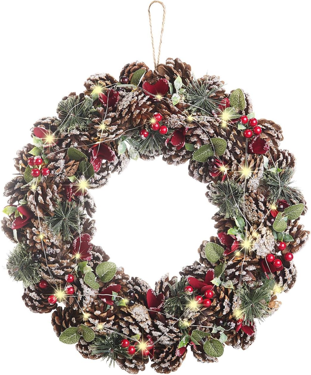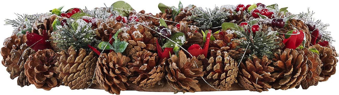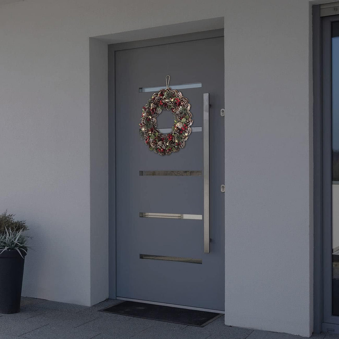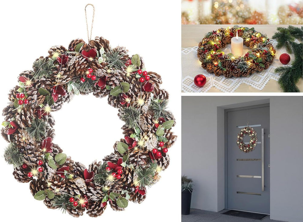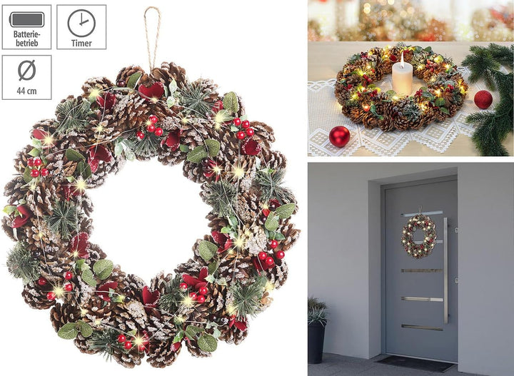 - Weihnachtlicher Kranz aus Tannenzapfen mit roten Highlights • Mit praktischer Kordel zum Aufhängen • Beleuchtung mit 30 warmweissen LEDs • Auto-Off: Schaltet sich nach 6 Stunden automatisch aus • 44 cm Durchmesser, 8 cm Höhe